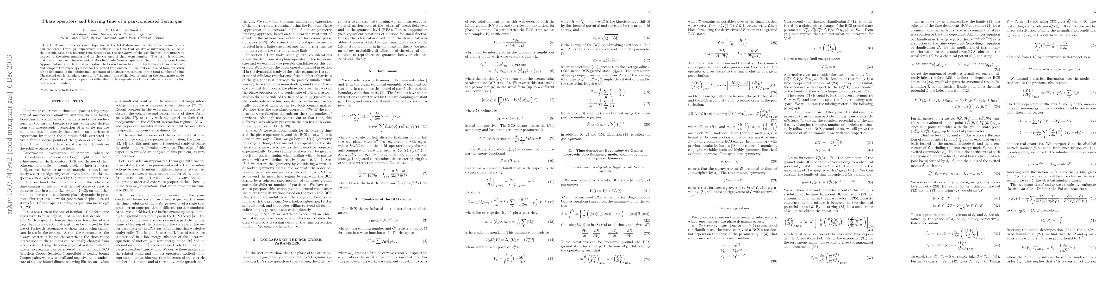 Due to atomic interactions and dispersion in the total atom number, the order parameter of a pair-condensed Fermi gas experiences a collapse in a time that we derive microscopically. As in the bosonic case, this blurring time depends on the derivative of the gas chemical potential with respect to the atom number and on the variance of that atom number. The result is obtained first using linearized time-dependent Bogoliubov-de Gennes equations, then in the Random Phase Approximation, and then it is generalized to beyond mean field. In this framework, we construct and compare two phase operators for the paired fermionic field: The first one, issued from our study of the dynamics, is the infinitesimal generator of adiabatic translations in the total number of pairs. The second one is the phase operator of the amplitude of the field of pairs on the condensate mode. We explain that these two operators differ due to the dependence of the condensate wave function on the atom number.