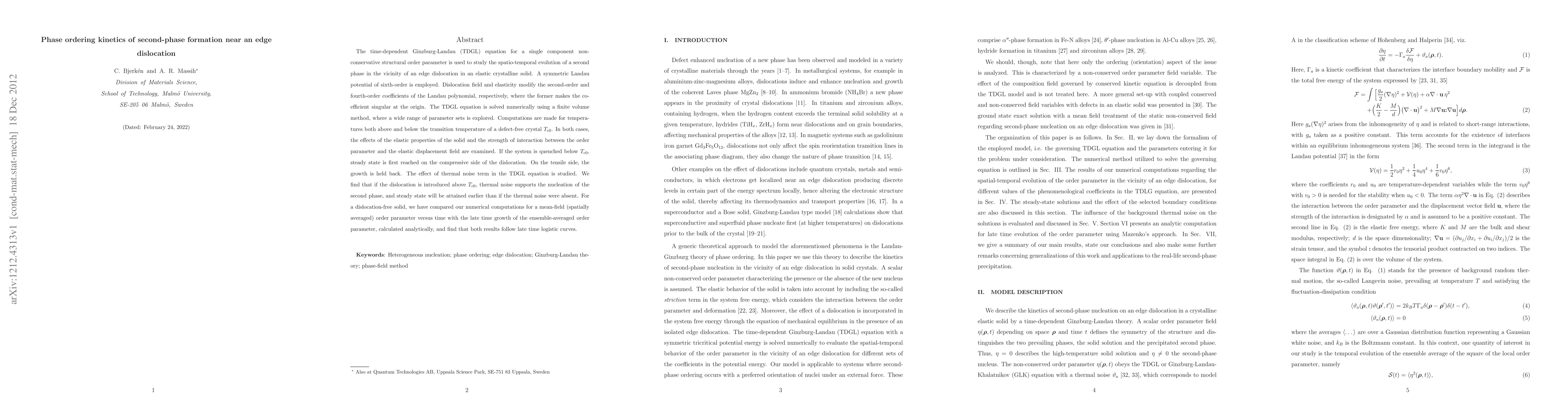 This paper uses the time-dependent Ginzburg-Landau equation to numerically study the kinetics of second-phase formation near an edge dislocation in an elastic crystalline solid, finding that the dislocation influences the phase ordering kinetics and thermal noise accelerates phase nucleation when the system is cooled below the transition temperature.