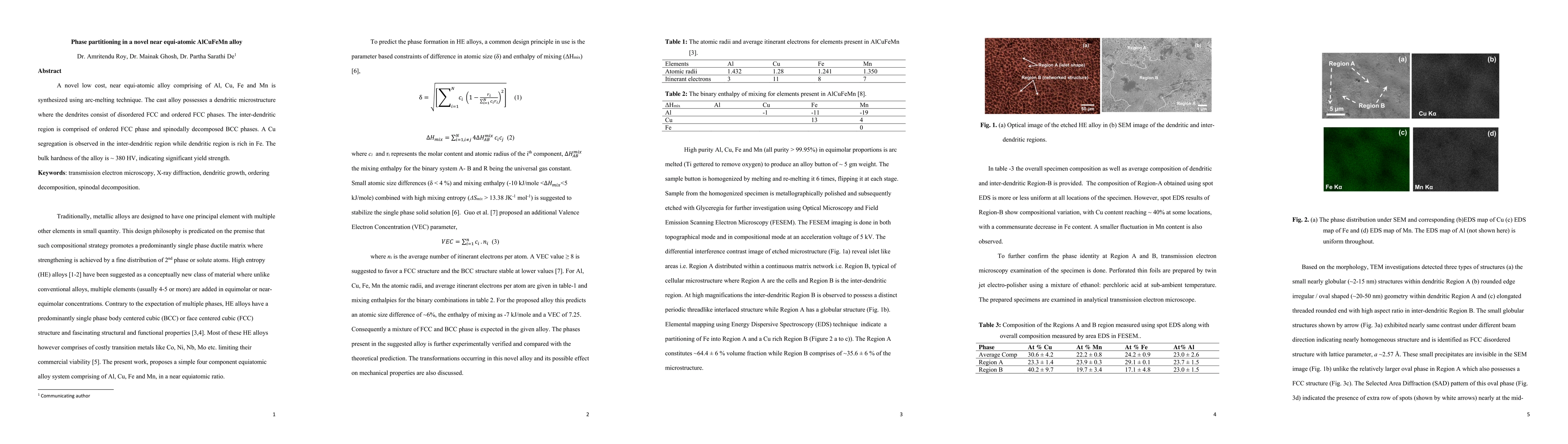 A novel low cost, near equi-atomic alloy comprising of Al, Cu, Fe and Mn is synthesized using arc-melting technique. The cast alloy possesses a dendritic microstructure where the dendrites consist of disordered FCC and ordered FCC phases. The inter-dendritic region is comprised of ordered FCC phase and spinodally decomposed BCC phases. A Cu segregation is observed in the inter-dendritic region while dendritic region is rich in Fe. The bulk hardness of the alloy is ~ 380 HV, indicating significant yield strength.