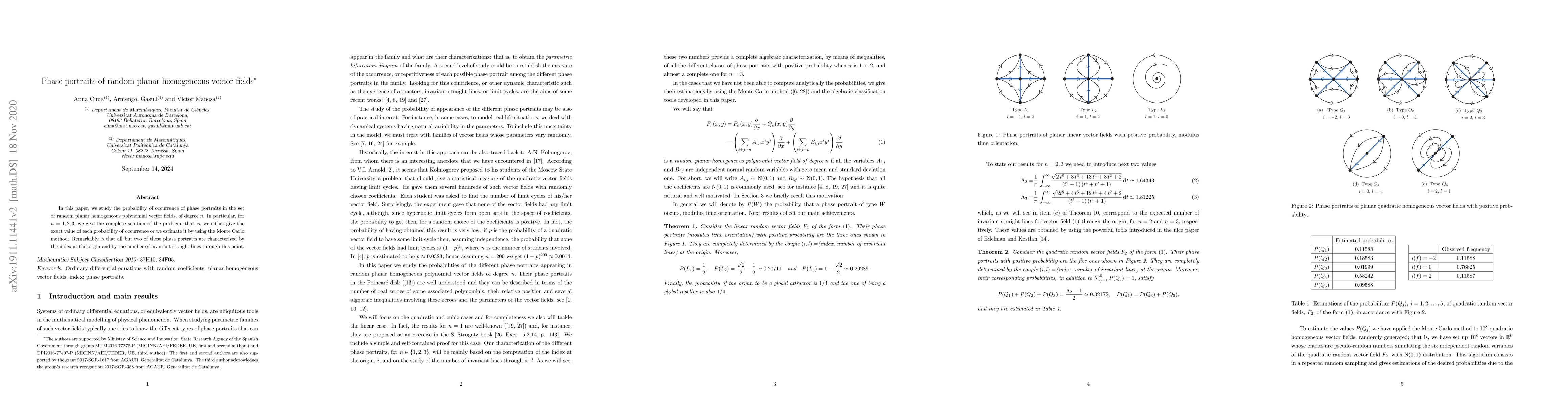 This paper investigates the phase portraits of random planar homogeneous vector fields of degree n, providing a complete solution for n=1,2,3. It characterizes most phase portraits by their index at the origin and the number of invariant straight lines, with exact probabilities or Monte Carlo estimates.
