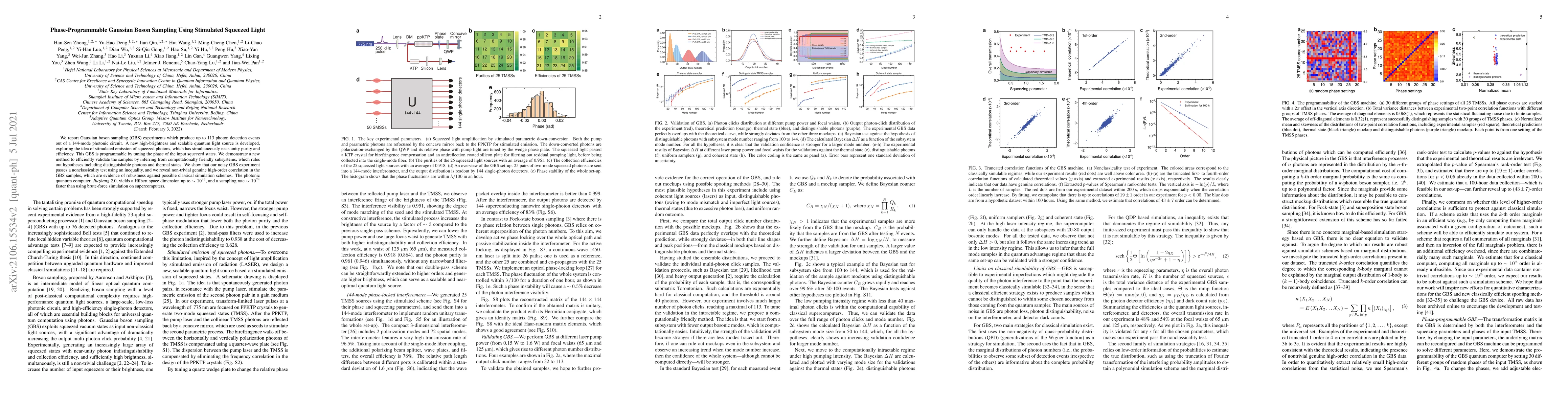 The research presents a new Gaussian Boson Sampling (GBS) experiment with 144 modes, generating up to 113 detection events. Utilizing stimulated squeezed photons, the method ensures high purity and efficiency, and the GBS is phase-programmable. The study introduces an efficient validation method for samples, demonstrating non-classicality and genuine high-order correlations, challenging classical simulation schemes. The photonic quantum computer, Jiuzhang 2.0, achieves a vast Hilbert space dimension and a significantly faster sampling rate than classical supercomputers.