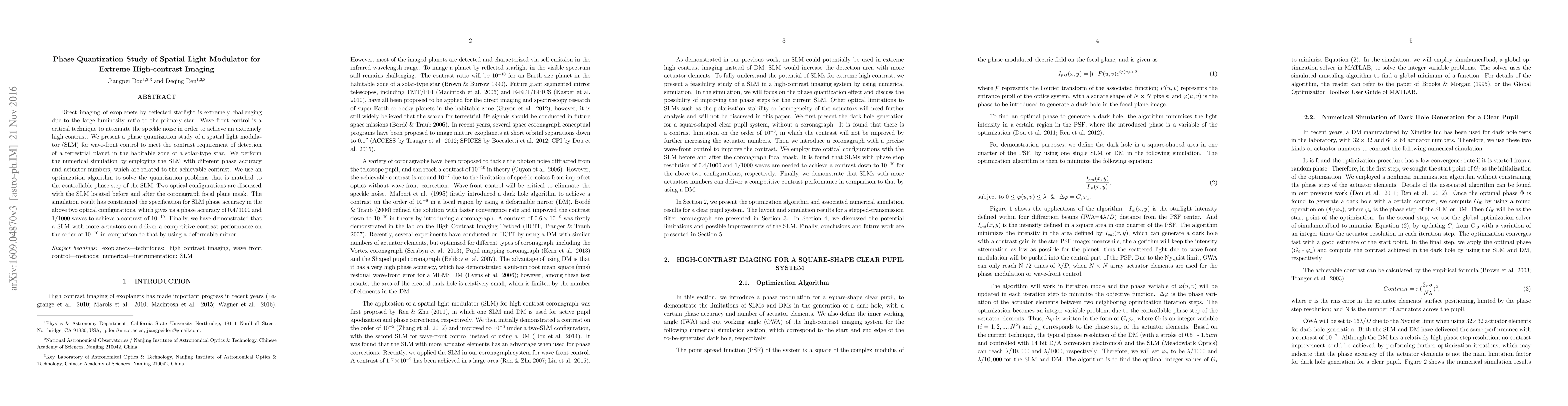 This paper investigates phase quantization of a spatial light modulator (SLM) for achieving high contrast imaging of exoplanets by controlling wavefront noise. The study uses numerical simulations to determine optimal SLM specifications and actuator numbers for different optical configurations, demonstrating that a SLM with sufficient actuators can match the performance of deformable mirrors.