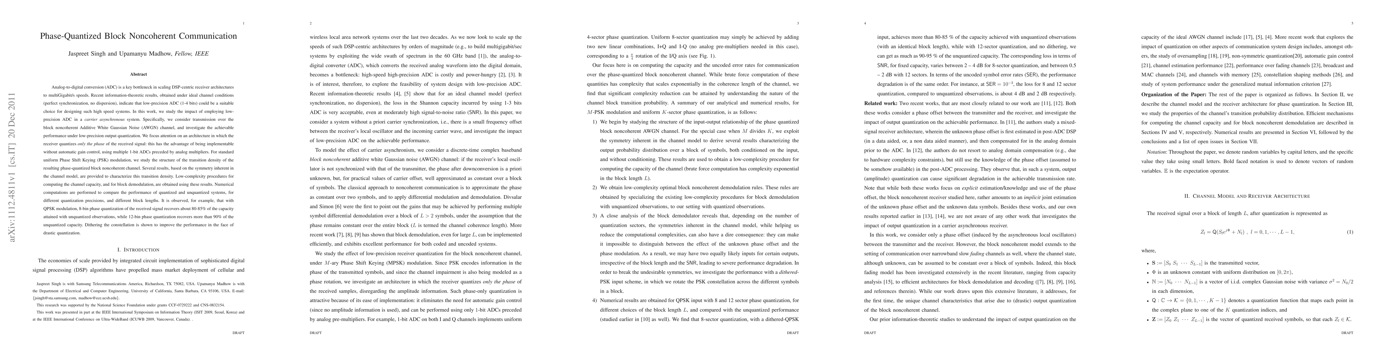 Analog-to-digital conversion (ADC) is a key bottleneck in scaling DSP-centric receiver architectures to multiGigabit/s speeds. Recent information-theoretic results, obtained under ideal channel conditions (perfect synchronization, no dispersion), indicate that low-precision ADC (1-4 bits) could be a suitable choice for designing such high speed systems. In this work, we study the impact of employing low-precision ADC in a {\it carrier asynchronous} system. Specifically, we consider transmission over the block noncoherent Additive White Gaussian Noise (AWGN) channel, and investigate the achievable performance under low-precision output quantization. We focus attention on an architecture in which the receiver quantizes {\it only the phase} of the received signal: this has the advantage of being implementable without automatic gain control, using multiple 1-bit ADCs preceded by analog multipliers. For standard uniform Phase Shift Keying (PSK) modulation, we study the structure of the transition density of the resulting phase-quantized block noncoherent channel. Several results, based on the symmetry inherent in the channel model, are provided to characterize this transition density. Low-complexity procedures for computing the channel capacity, and for block demodulation, are obtained using these results. Numerical computations are performed to compare the performance of quantized and unquantized systems, for different quantization precisions, and different block lengths. It is observed, for example, that with QPSK modulation, 8-bin phase quantization of the received signal recovers about 80-85% of the capacity attained with unquantized observations, while 12-bin phase quantization recovers more than 90% of the unquantized capacity. Dithering the constellation is shown to improve the performance in the face of drastic quantization.