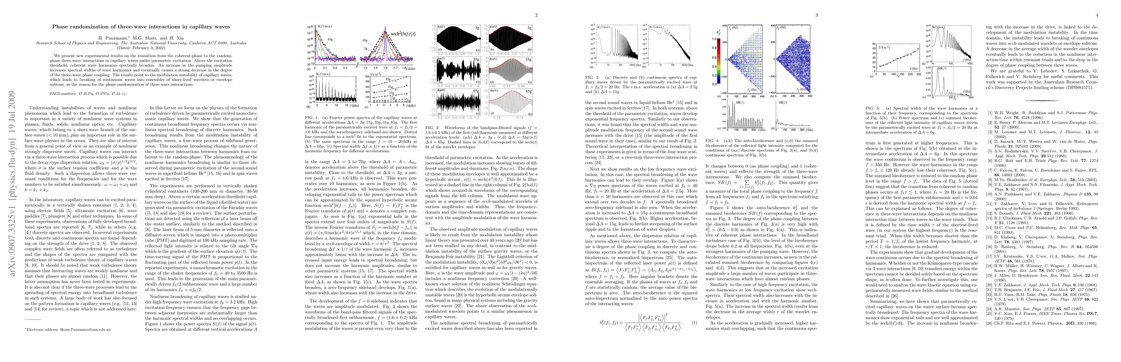 This paper investigates the transition from coherent to random phase in three-wave interactions in capillary waves under parametric excitation, revealing that increased pumping amplitude leads to spectral broadening and decreased phase coupling, attributed to modulation instability causing wavelet or soliton formation.