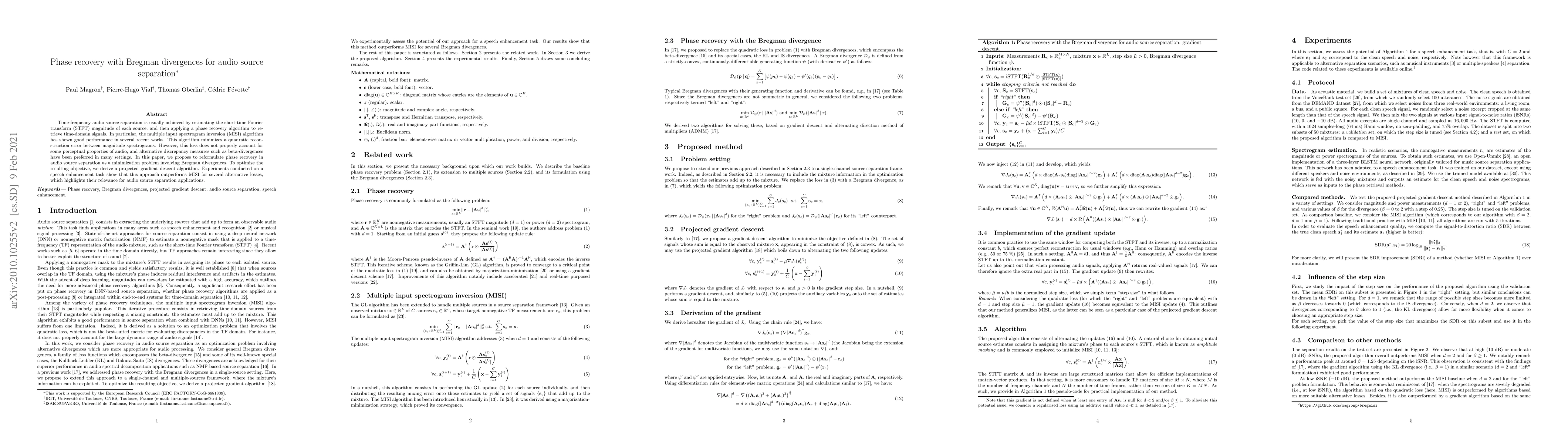 This paper proposes a new method for audio source separation using Bregman divergences for phase recovery, which outperforms the traditional MISI algorithm by better accounting for perceptual audio properties. The approach involves a projected gradient descent algorithm to optimize the new objective function.
