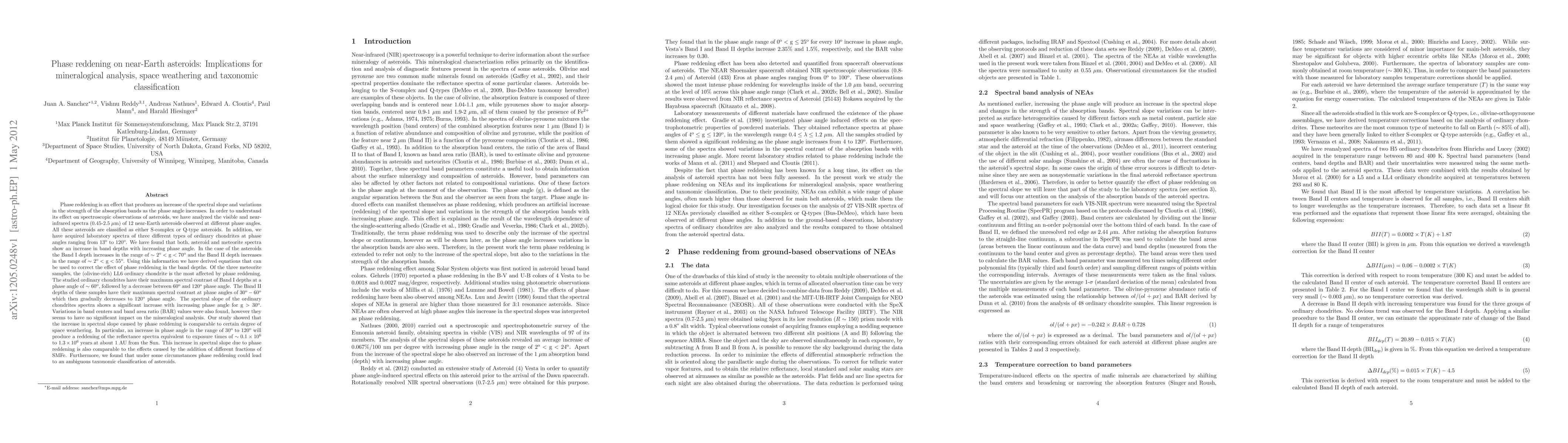 This study investigates phase reddening's impact on the spectroscopic observations of near-Earth asteroids, finding that it increases spectral slope and absorption band depths, mimicking space weathering effects. The research suggests that phase reddening could lead to ambiguous taxonomic classifications of asteroids.