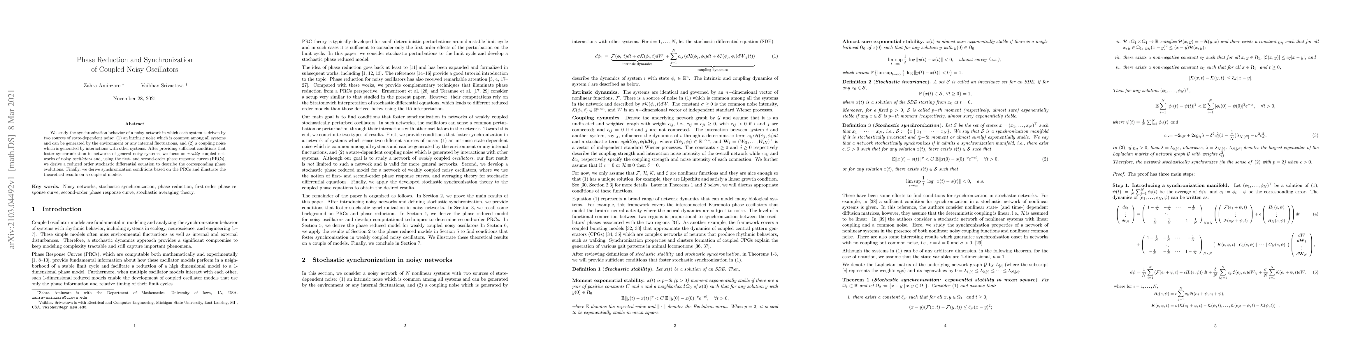 This paper investigates synchronization in noisy networks of oscillators driven by intrinsic and coupling noise, deriving reduced order stochastic differential equations using phase response curves. It establishes synchronization conditions and demonstrates the theoretical results through specific models.