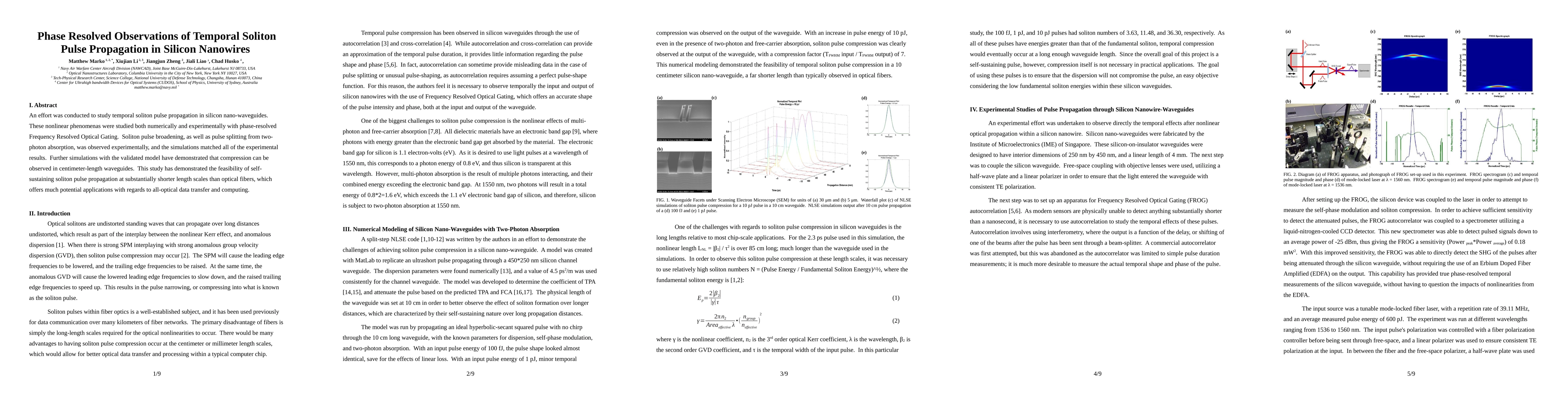 An effort was conducted to study temporal soliton pulse propagation in silicon nano-waveguides. These nonlinear phenomenas were studied both numerically and experimentally with phase-resolved Frequency Resolved Optical Gating. Soliton pulse broadening, as well as pulse splitting from two-photon absorption, was observed experimentally, and the simulations matched all of the experimental results. Further simulations with the validated model have demonstrated that compression can be observed in centimeter-length waveguides. This study has demonstrated the feasibility of self-sustaining soliton pulse propagation at substantially shorter length scales than optical fibers, which offers much potential applications with regards to all-optical data transfer and computing.