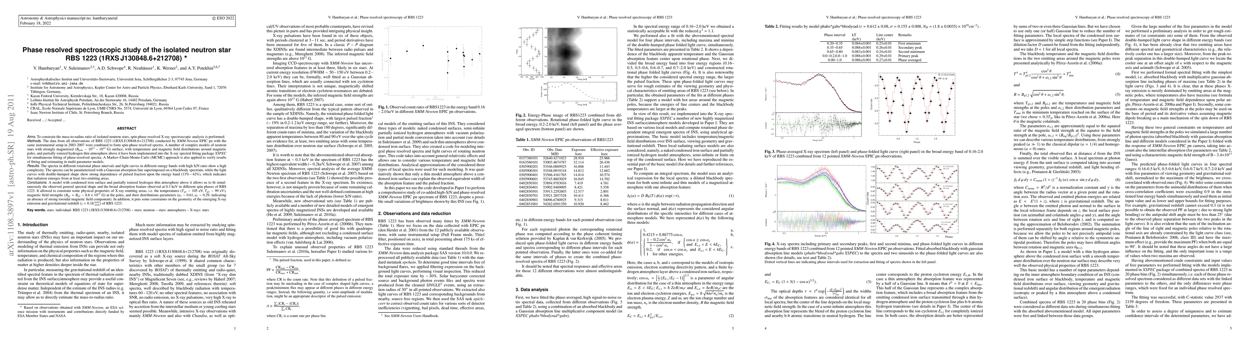 The data from all observations of RBS 1223 (1RXS J130848.6+212708) conducted by XMM-Newton EPIC pn with the same instrumental setup in 2003-2007 were combined to form spin-phase resolved spectra. A number of complex models of neutron stars with strongly magnetized ($B_{pole} 10^{13}-10^{14}$ G) surface, with temperature and magnetic field distributions around magnetic poles, and partially ionized hydrogen thin atmosphere above it have been implemented into the X-ray spectral fitting package XSPEC for simultaneous fitting of phase-resolved spectra. A Markov-Chain-Monte-Carlo (MCMC) approach is also applied to verify results of fitting and estimating in multi parameter models. The spectra in different rotational phase intervals and light curves in different energy bands with high S/N ratio show a high complexity. The spectra can be parameterized with a Gaussian absorption line superimposed on a blackbody spectrum, while the light curves with double-humped shape show strong dependence of pulsed fraction upon the energy band (13%-42%), which indicates that radiation emerges from at least two emitting areas. A model with condensed iron surface and partially ionized hydrogen thin atmosphere above it allows us to fit simultaneously the observed general spectral shape and the broad absorption feature observed at 0.3 keV in different spin phases of RBS 1223. It allowed to constrain some physical properties of X-ray emitting areas, i.e. the temperatures ($T_{p1} ~ 105$ eV, $T_{p2} ~ 99$ eV), magnetic field strengths ($B_{p1}= B_{p2} ~ 8.6x10^{13}$G) at the poles, and their distributions parameters ($a_{1} 0.61, a_{2} 0.29$, indicating an absence of strong toroidal magnetic field component). In addition, it puts some constraints on the geometry of the emerging X-ray emission and gravitational redshift ($z=0.16^{+0.03}_{-0.01}$) of RBS 1223.