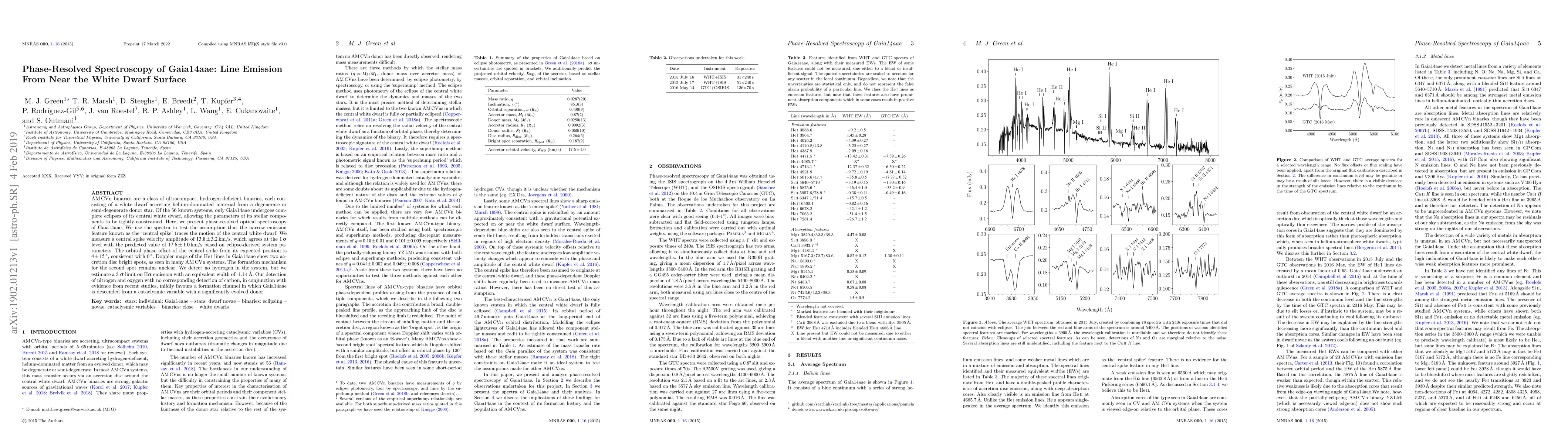 The study presents phase-resolved optical spectroscopy of the AM CVn binary Gaia14aae, confirming the 'central spike' traces the white dwarf's motion with a velocity amplitude of 13.8 ± 3.2 km/s, consistent with predictions. Doppler maps reveal two accretion disc bright spots, with nitrogen and oxygen detected but no hydrogen, suggesting a cataclysmic variable origin for the donor star.