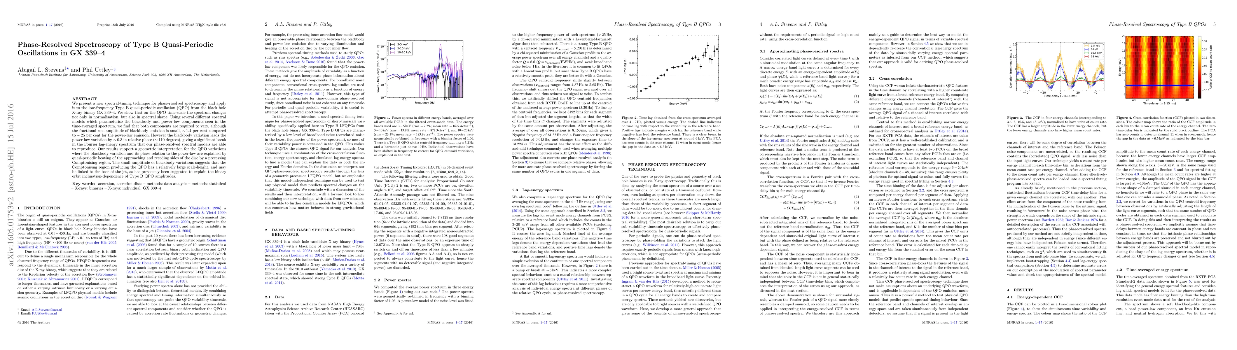 We present a new spectral-timing technique for phase-resolved spectroscopy and apply it to the low-frequency Type B quasi-periodic oscillation (QPO) from the black hole X-ray binary GX 339-4. We show that on the QPO time-scale the spectrum changes not only in normalisation, but also in spectral shape. Using several different spectral models which parameterise the blackbody and power-law components seen in the time-averaged spectrum, we find that both components are required to vary, although the fractional rms amplitude of blackbody emission is small, ~1.4 per cent compared to ~25 per cent for the power-law emission. However the blackbody variation leads the power-law variation by ~0.3 in relative phase (~110 degrees), giving a significant break in the Fourier lag-energy spectrum that our phase-resolved spectral models are able to reproduce. Our results support a geometric interpretation for the QPO variations where the blackbody variation and its phase relation to the power-law are explained by quasi-periodic heating of the approaching and receding sides of the disc by a precessing Comptonising region. The small amplitude of blackbody variations suggests that the Comptonising region producing the QPO has a relatively large scale-height, and may be linked to the base of the jet, as has previously been suggested to explain the binary orbit inclination-dependence of Type B QPO amplitudes.