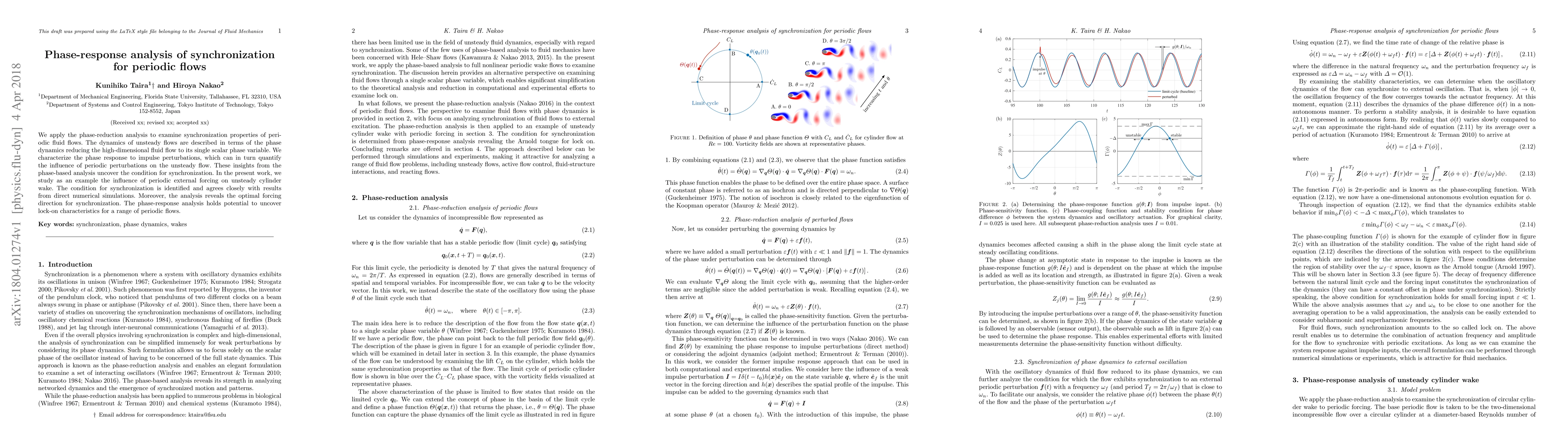 We apply the phase-reduction analysis to examine synchronization properties of periodic fluid flows. The dynamics of unsteady flows are described in terms of the phase dynamics reducing the high-dimensional fluid flow to its single scalar phase variable. We characterize the phase response to impulse perturbations, which can in turn quantify the influence of periodic perturbations on the unsteady flow. These insights from the phase-based analysis uncover the condition for synchronization. In the present work, we study as an example the influence of periodic external forcing on unsteady cylinder wake. The condition for synchronization is identified and agrees closely with results from direct numerical simulations. Moreover, the analysis reveals the optimal forcing direction for synchronization. The phase-response analysis holds potential to uncover lock-on characteristics for a range of periodic flows.