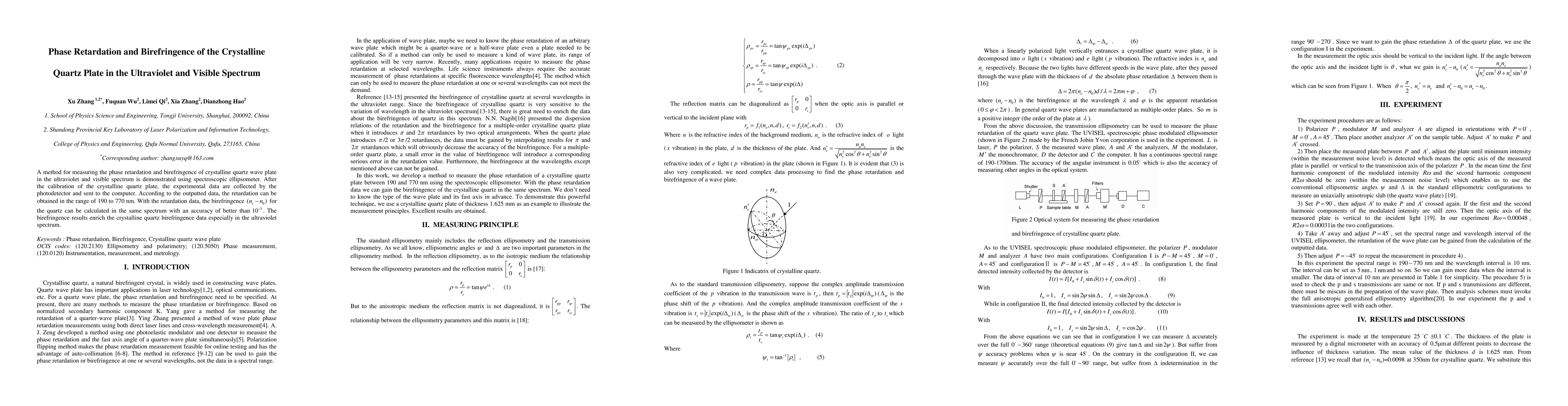 This study demonstrates a method using a spectroscopic ellipsometer to measure phase retardation and birefringence of crystalline quartz plates across the ultraviolet and visible spectrum. The results provide detailed birefringence data, particularly in the ultraviolet range, enhancing the understanding of quartz's optical properties.