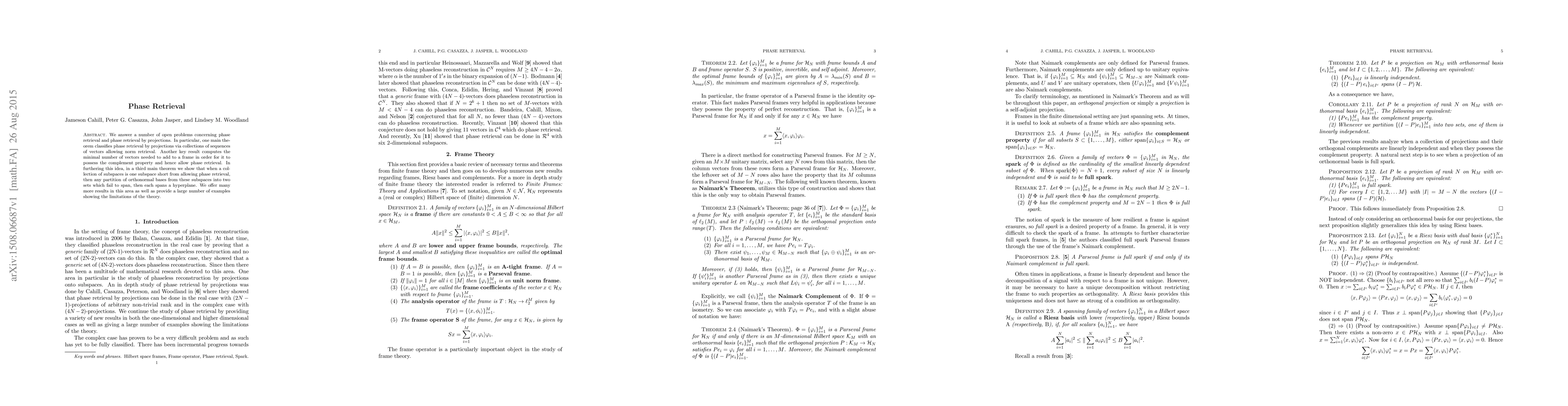 We answer a number of open problems concerning phase retrieval and phase retrieval by projections. In particular, one main theorem classifies phase retrieval by projections via collections of sequences of vectors allowing norm retrieval. Another key result computes the minimal number of vectors needed to add to a frame in order for it to possess the complement property and hence allow phase retrieval. In furthering this idea, in a third main theorem we show that when a collection of subspaces is one subspace short from allowing phase retrieval, then any partition of orthonormal bases from these subspaces into two sets which fail to span, then each spans a hyperplane. We offer many more results in this area as well as provide a large number of examples showing the limitations of the theory.