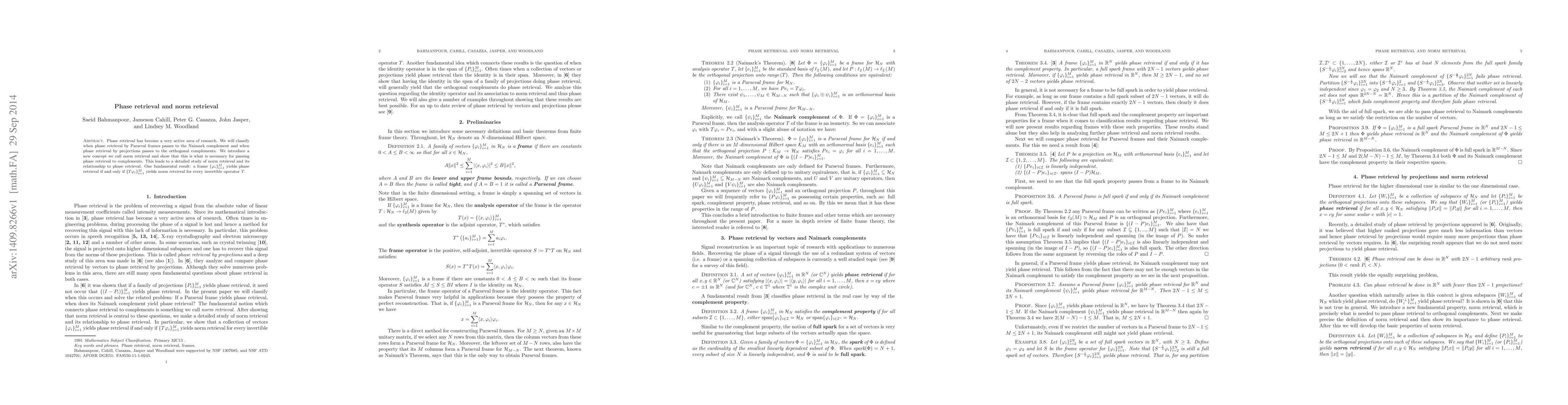 The paper introduces the concept of norm retrieval and establishes its equivalence with phase retrieval, providing a new perspective on the conditions under which phase retrieval is achievable.