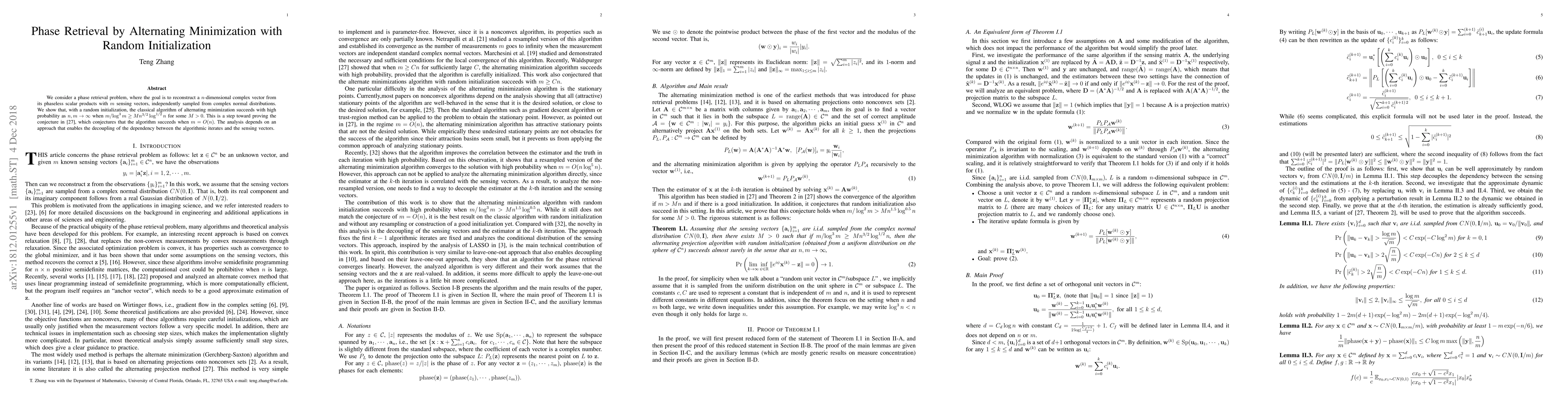 This paper investigates a phase retrieval problem where a complex vector is reconstructed from its phaseless scalar products. It demonstrates that alternating minimization with random initialization succeeds with high probability under certain conditions on the number of sensing vectors and dimensions, supporting a conjecture that the algorithm works when the number of measurements is proportional to the dimension.