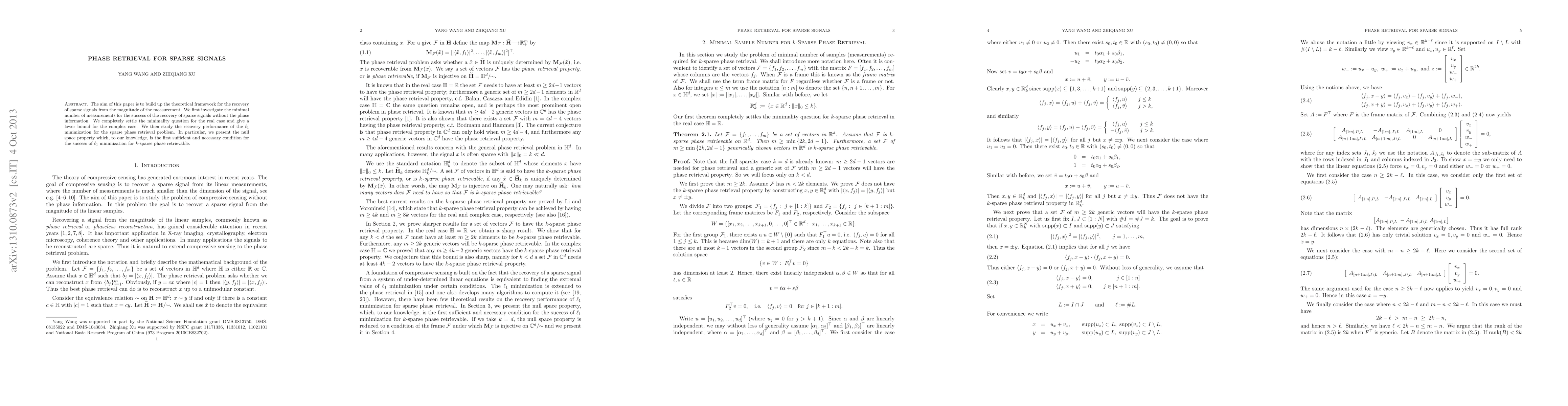 The aim of this paper is to build up the theoretical framework for the recovery of sparse signals from the magnitude of the measurement. We first investigate the minimal number of measurements for the success of the recovery of sparse signals without the phase information. We completely settle the minimality question for the real case and give a lower bound for the complex case. We then study the recovery performance of the $\ell_1$ minimization. In particular, we present the null space property which, to our knowledge, is the first sufficient and necessary condition for the success of $\ell_1$ minimization for $k$-sparse phase retrievable.