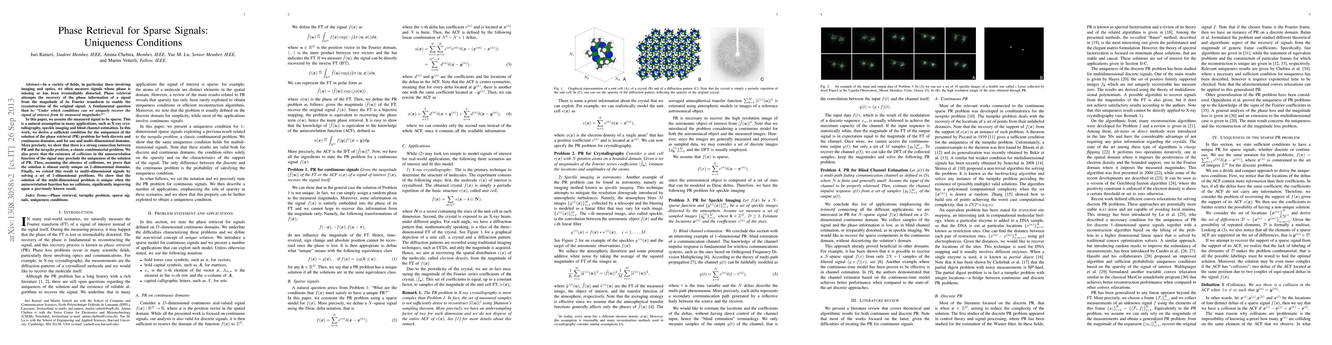 In a variety of fields, in particular those involving imaging and optics, we often measure signals whose phase is missing or has been irremediably distorted. Phase retrieval attempts the recovery of the phase information of a signal from the magnitude of its Fourier transform to enable the reconstruction of the original signal. A fundamental question then is: "Under which conditions can we uniquely recover the signal of interest from its measured magnitudes?" In this paper, we assume the measured signal to be sparse. This is a natural assumption in many applications, such as X-ray crystallography, speckle imaging and blind channel estimation. In this work, we derive a sufficient condition for the uniqueness of the solution of the phase retrieval (PR) problem for both discrete and continuous domains, and for one and multi-dimensional domains. More precisely, we show that there is a strong connection between PR and the turnpike problem, a classic combinatorial problem. We also prove that the existence of collisions in the autocorrelation function of the signal may preclude the uniqueness of the solution of PR. Then, assuming the absence of collisions, we prove that the solution is almost surely unique on 1-dimensional domains. Finally, we extend this result to multi-dimensional signals by solving a set of 1-dimensional problems. We show that the solution of the multi-dimensional problem is unique when the autocorrelation function has no collisions, significantly improving upon a previously known result.
