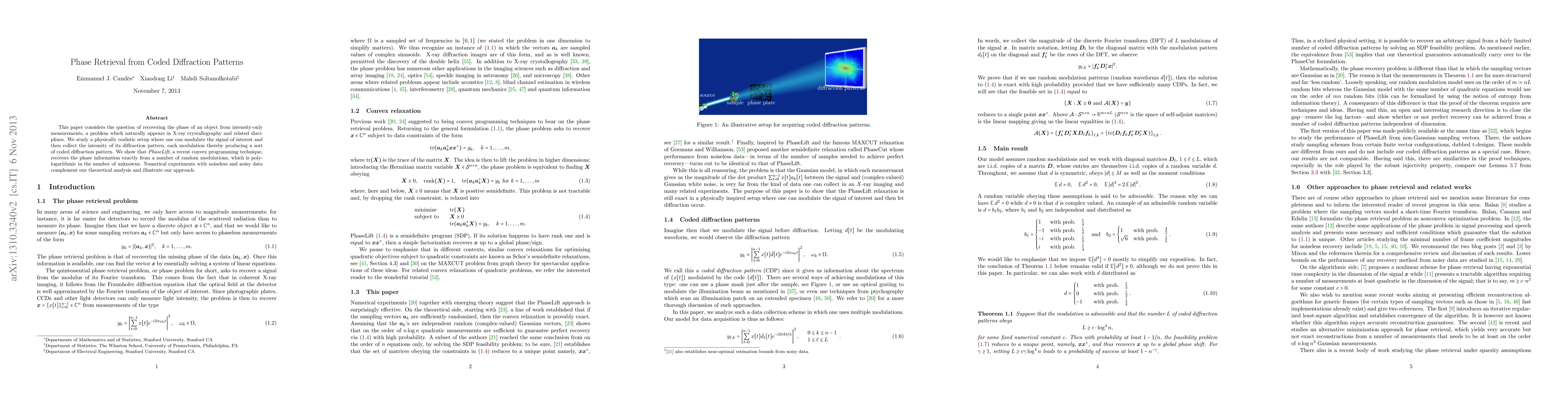 This paper considers the question of recovering the phase of an object from intensity-only measurements, a problem which naturally appears in X-ray crystallography and related disciplines. We study a physically realistic setup where one can modulate the signal of interest and then collect the intensity of its diffraction pattern, each modulation thereby producing a sort of coded diffraction pattern. We show that PhaseLift, a recent convex programming technique, recovers the phase information exactly from a number of random modulations, which is polylogarithmic in the number of unknowns. Numerical experiments with noiseless and noisy data complement our theoretical analysis and illustrate our approach.