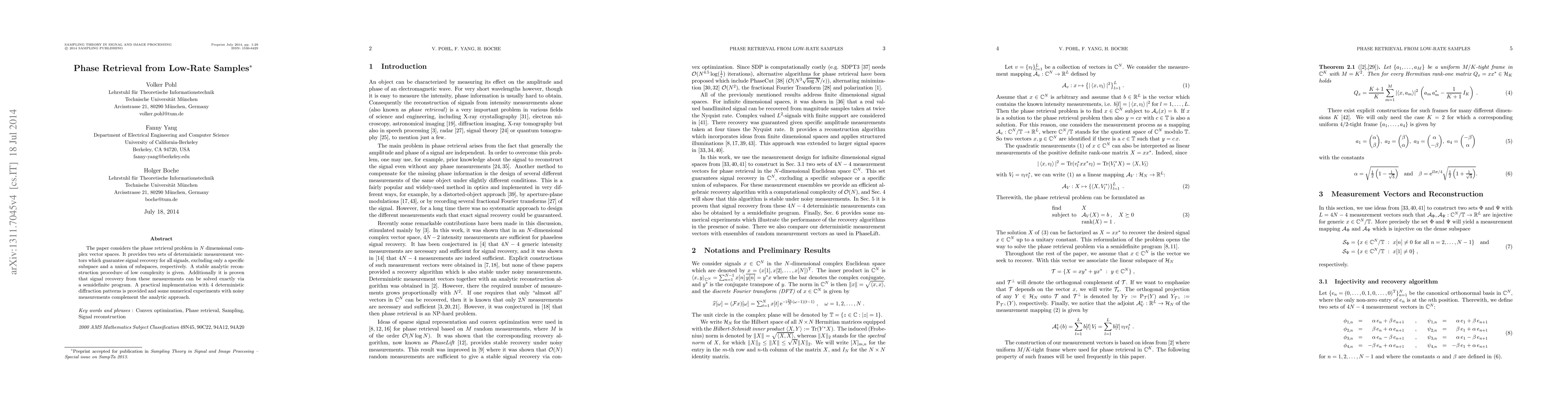 The paper considers the phase retrieval problem in N-dimensional complex vector spaces. It provides two sets of deterministic measurement vectors which guarantee signal recovery for all signals, excluding only a specific subspace and a union of subspaces, respectively. A stable analytic reconstruction procedure of low complexity is given. Additionally it is proven that signal recovery from these measurements can be solved exactly via a semidefinite program. A practical implementation with 4 deterministic diffraction patterns is provided and some numerical experiments with noisy measurements complement the analytic approach.