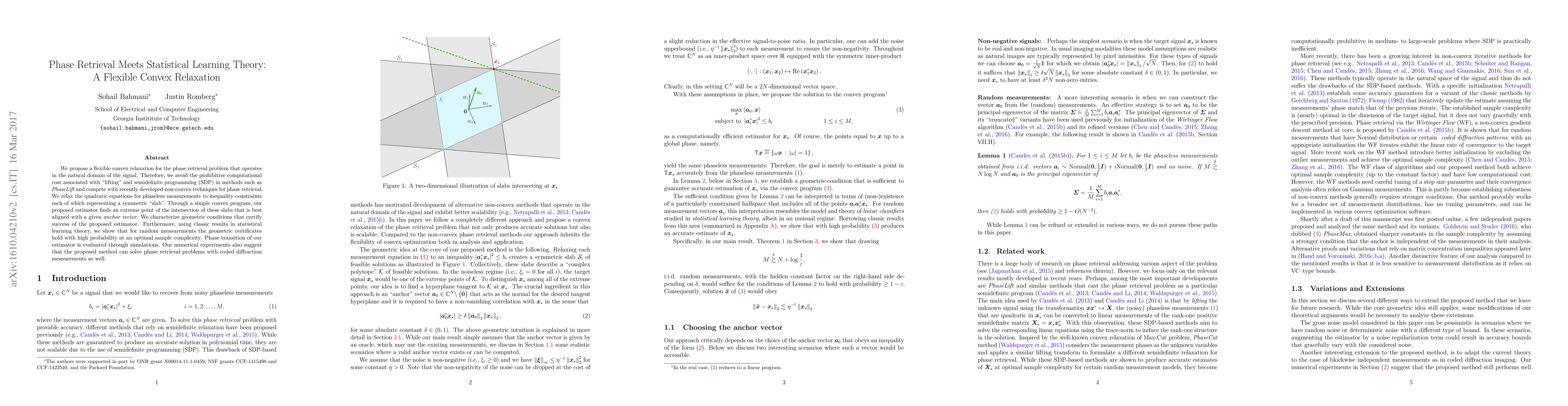 This paper proposes a flexible convex relaxation for phase retrieval, avoiding high computational costs of semidefinite programming and competing with non-convex techniques. It uses a convex program to find an optimal solution based on symmetric "slab" constraints, and demonstrates its effectiveness through statistical learning theory and simulations.
