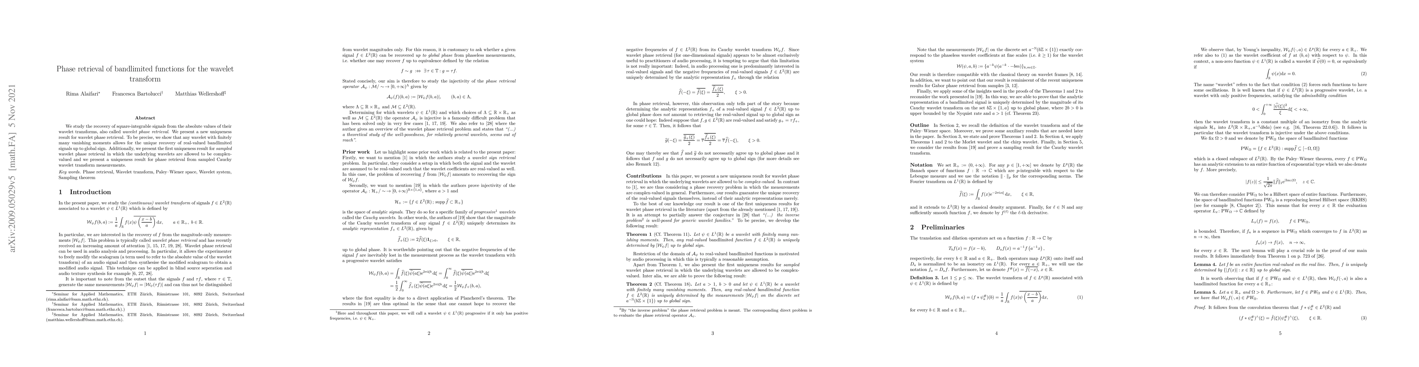 The paper presents a study on the recovery of square-integrable signals from the absolute values of their wavelet transforms, known as wavelet phase retrieval. It introduces new uniqueness results for wavelet phase retrieval, including complex-valued wavelets and sampled Cauchy wavelet transform measurements.