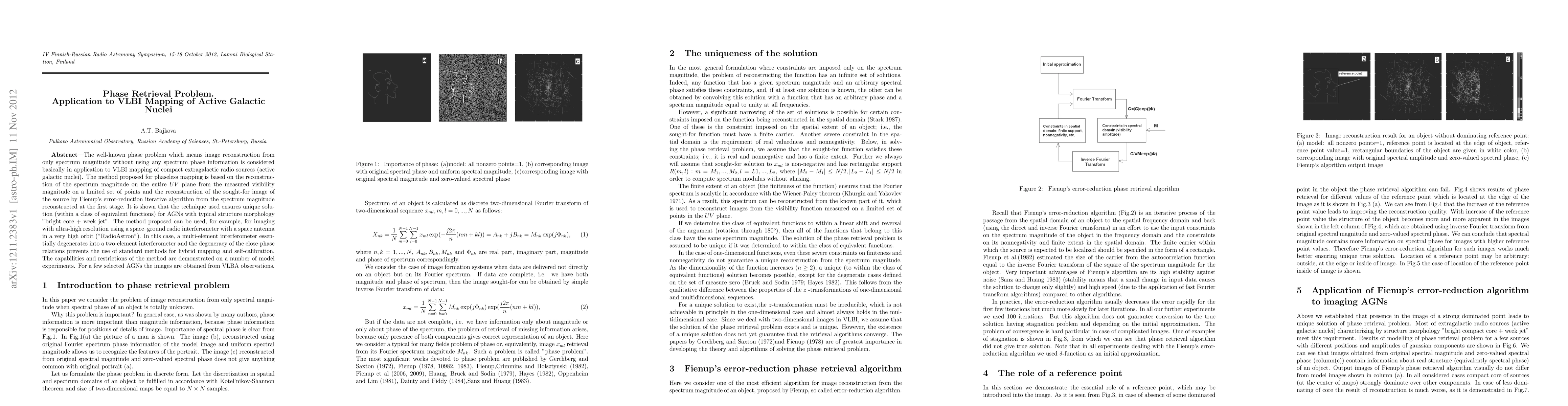 This paper addresses the phase retrieval problem for VLBI mapping of active galactic nuclei (AGNs), proposing a method to reconstruct images from visibility magnitudes without phase information. The technique uses Fienup's error-reduction algorithm and demonstrates unique solutions for AGNs with typical morphology, validated through model experiments and VLBA observations.