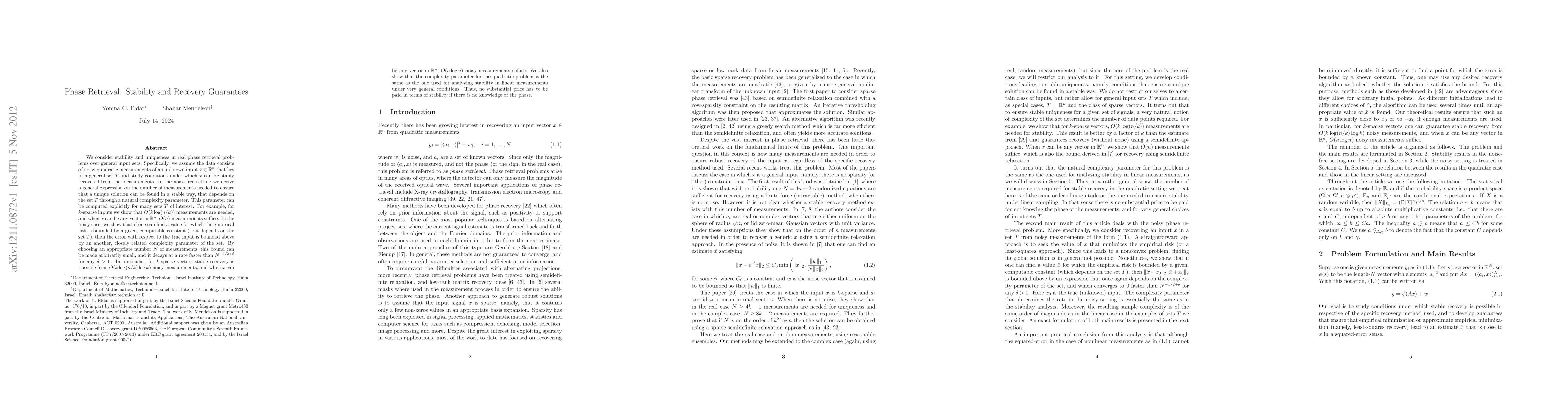 We consider stability and uniqueness in real phase retrieval problems over general input sets. Specifically, we assume the data consists of noisy quadratic measurements of an unknown input x in R^n that lies in a general set T and study conditions under which x can be stably recovered from the measurements. In the noise-free setting we derive a general expression on the number of measurements needed to ensure that a unique solution can be found in a stable way, that depends on the set T through a natural complexity parameter. This parameter can be computed explicitly for many sets T of interest. For example, for k-sparse inputs we show that O(k\log(n/k)) measurements are needed, and when x can be any vector in R^n, O(n) measurements suffice. In the noisy case, we show that if one can find a value for which the empirical risk is bounded by a given, computable constant (that depends on the set T), then the error with respect to the true input is bounded above by an another, closely related complexity parameter of the set. By choosing an appropriate number N of measurements, this bound can be made arbitrarily small, and it decays at a rate faster than N^{-1/2+\delta} for any \delta>0. In particular, for k-sparse vectors stable recovery is possible from O(k\log(n/k)\log k) noisy measurements, and when x can be any vector in R^n, O(n \log n) noisy measurements suffice. We also show that the complexity parameter for the quadratic problem is the same as the one used for analyzing stability in linear measurements under very general conditions. Thus, no substantial price has to be paid in terms of stability if there is no knowledge of the phase.