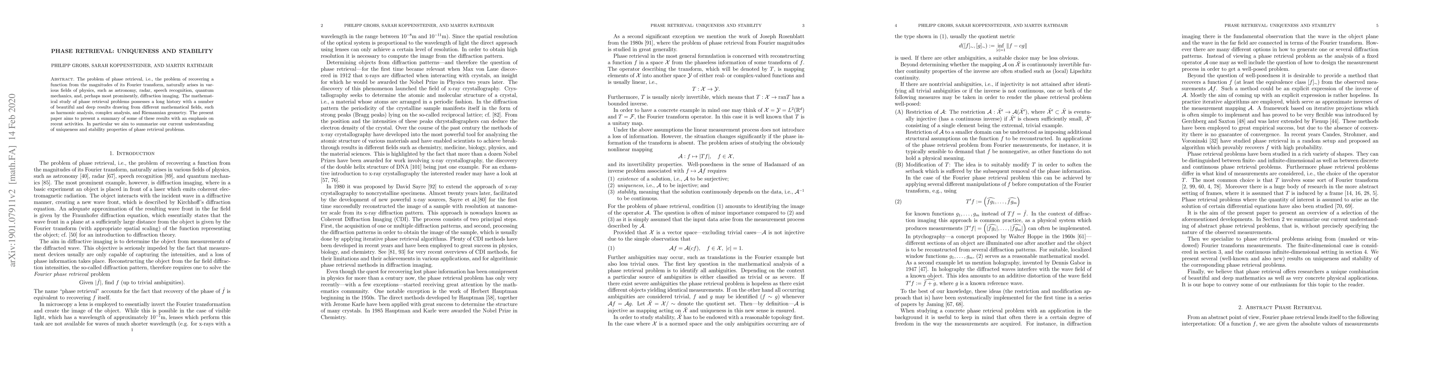 This paper reviews mathematical results on phase retrieval, focusing on the recovery of functions from their Fourier transform magnitudes, and highlights recent advancements in understanding the uniqueness and stability of these problems across various fields of physics.