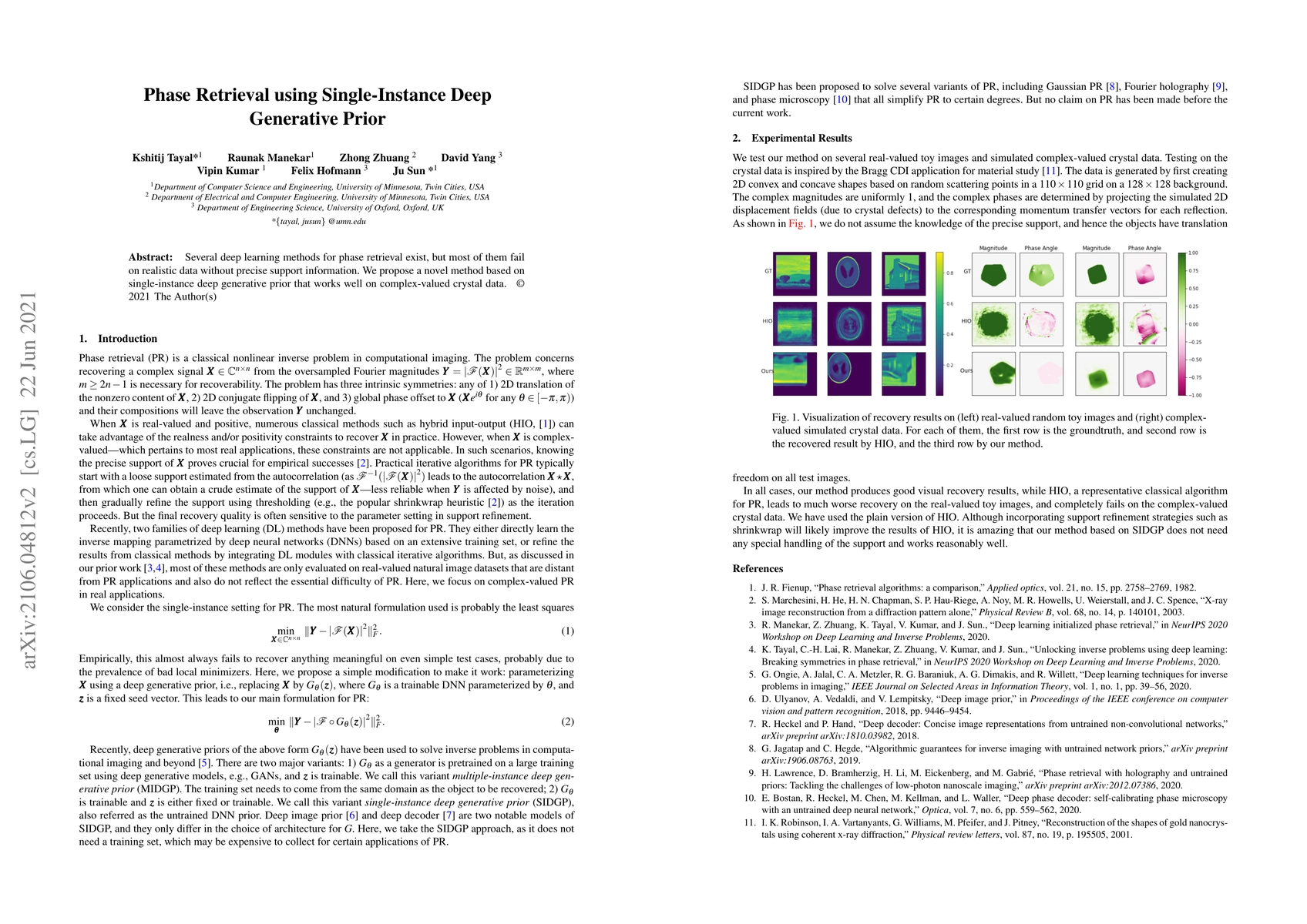 Summary: This paper introduces a novel deep learning method for phase retrieval using a single-instance deep generative prior, demonstrating effective performance on complex-valued crystal data despite the absence of precise support information.