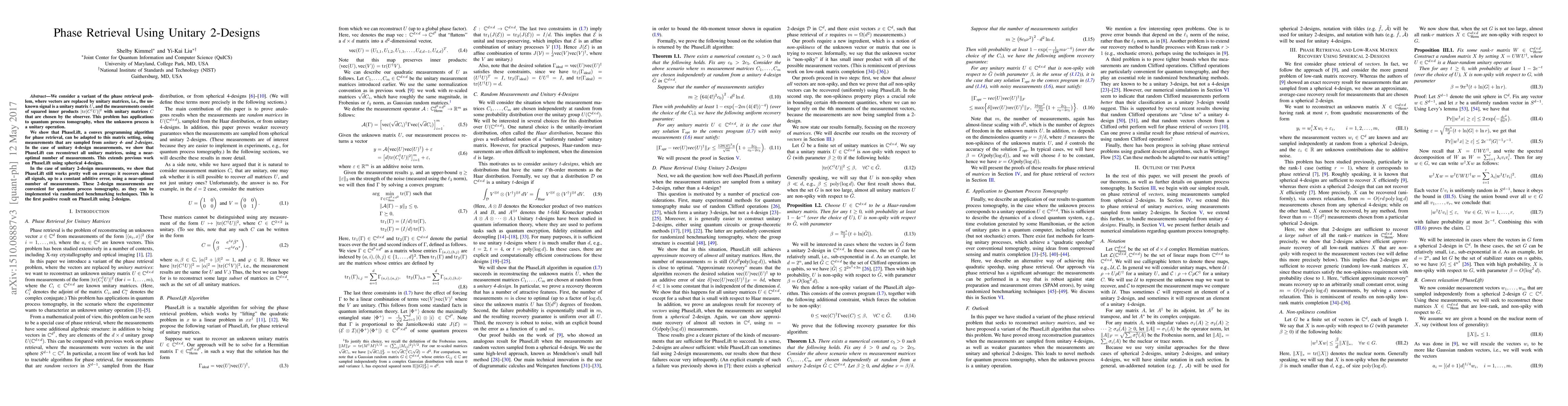 This paper explores a phase retrieval problem for unitary matrices, adapting PhaseLift for measurements taken from unitary 2- and 4-designs. It demonstrates successful reconstruction using near-optimal measurement counts, extending PhaseLift’s applicability to quantum process tomography via randomized benchmarking.