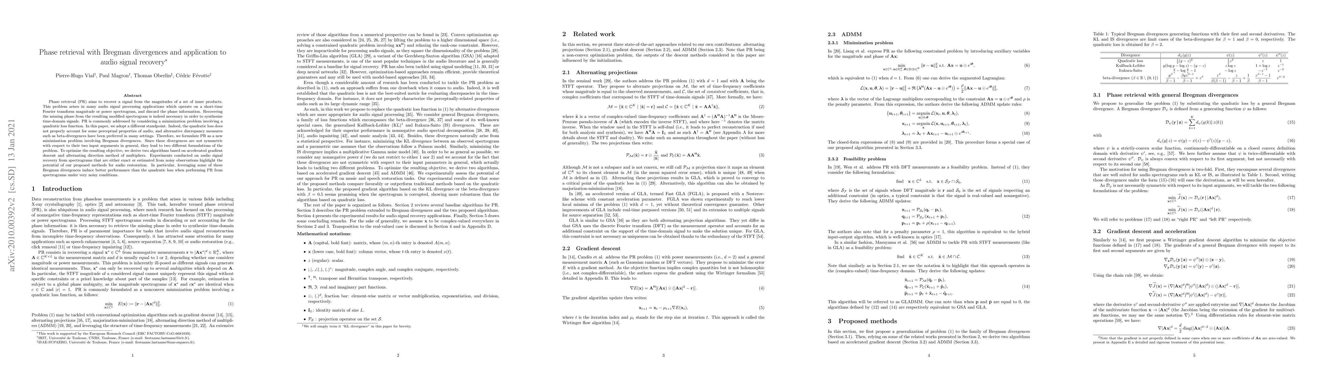 This paper proposes a novel phase retrieval method using Bregman divergences for audio signal recovery, addressing the limitations of traditional quadratic loss functions. The authors develop two optimization algorithms and demonstrate superior performance in noisy conditions compared to conventional methods.