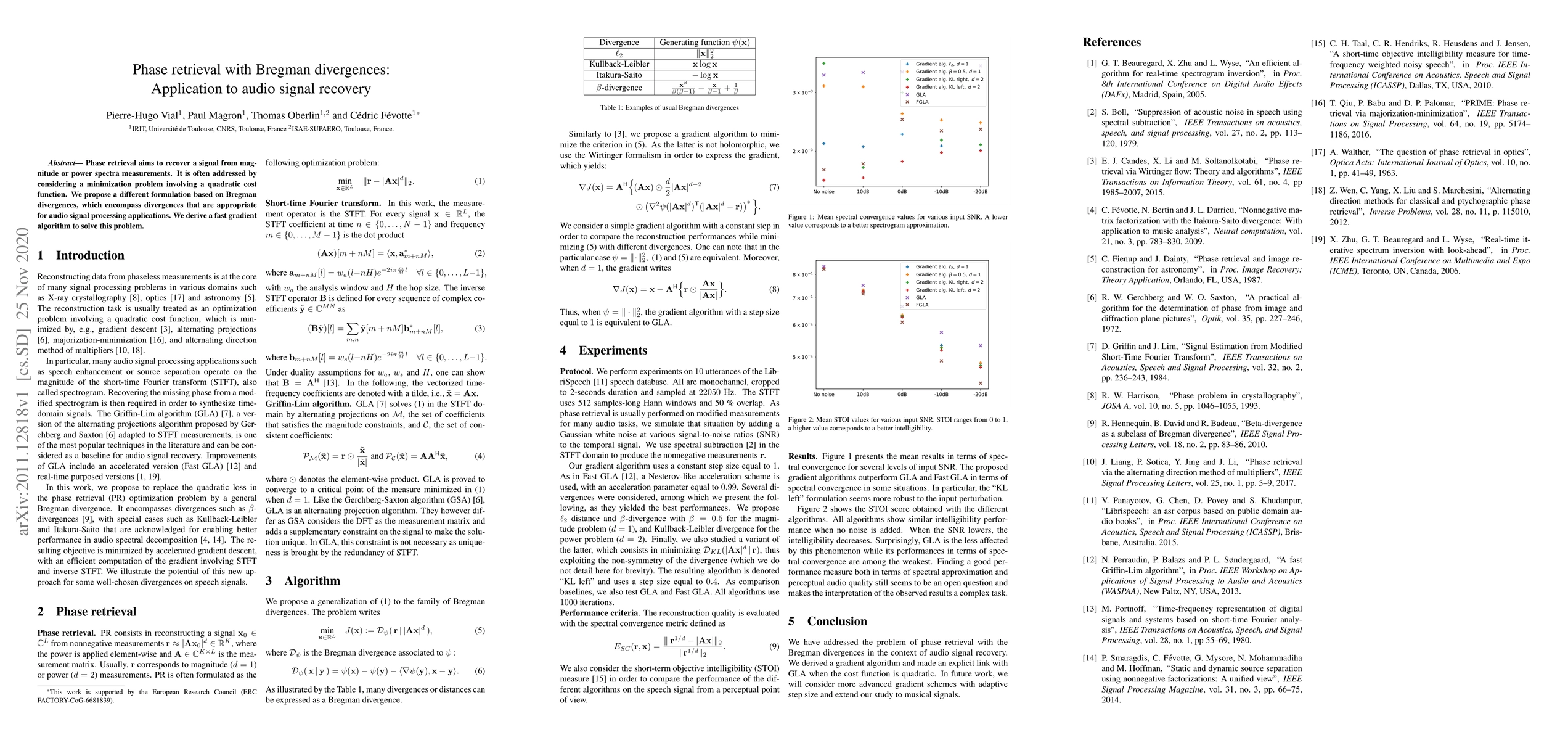 This paper proposes a novel phase retrieval method using Bregman divergences for audio signal recovery from magnitude spectra. It introduces a fast gradient algorithm to solve the minimization problem, offering an alternative to traditional quadratic cost functions.