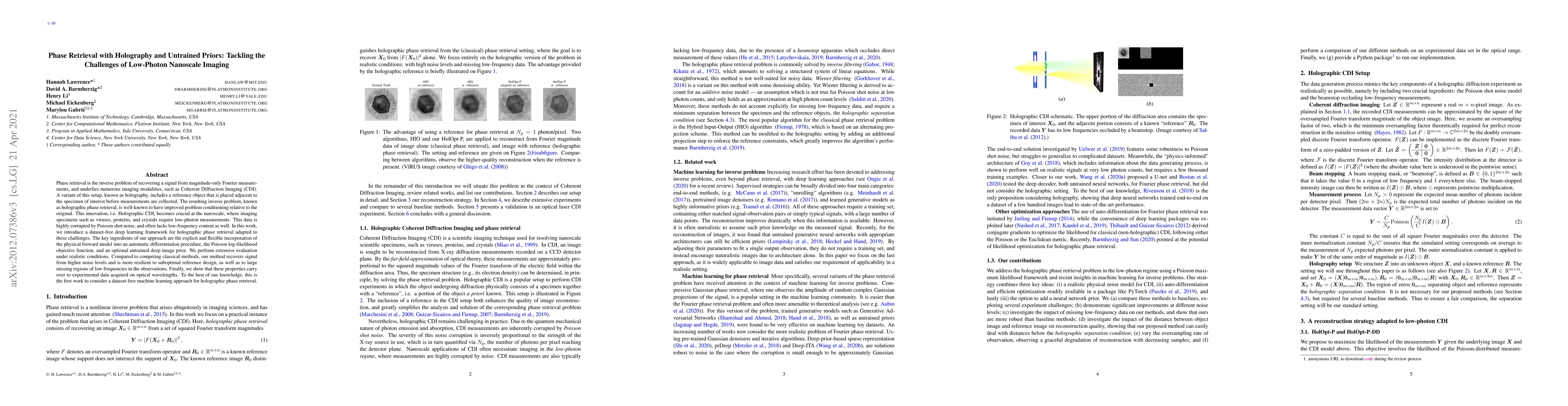 This paper proposes a novel dataset-free deep learning framework for holographic phase retrieval, addressing the challenges of low-photon nanoscale imaging. The method incorporates the physical forward model and a Poisson log-likelihood objective, demonstrating superior performance in recovering signals from noisy data compared to classical methods.
