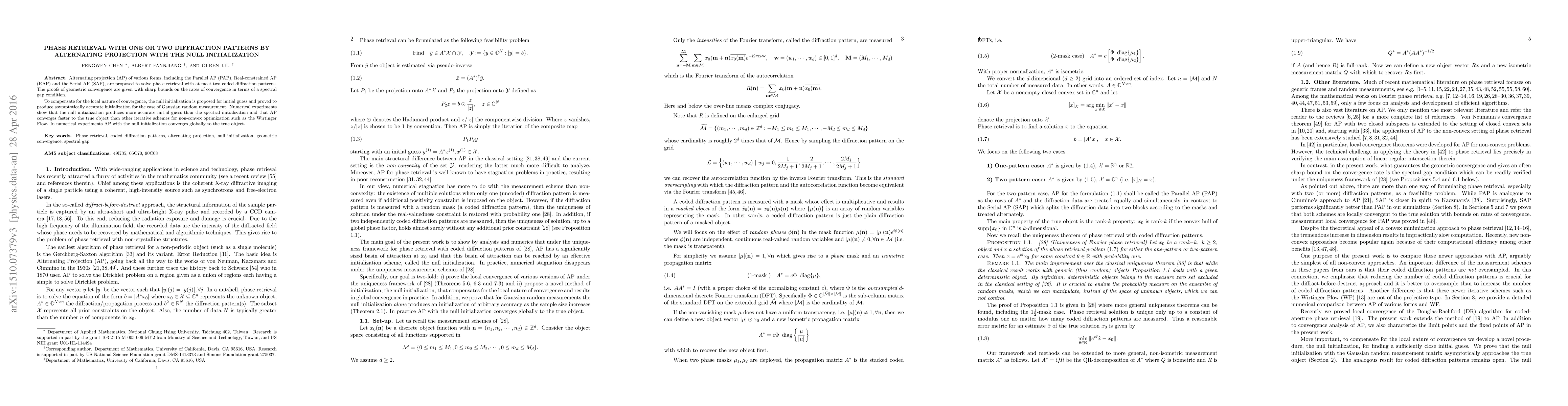 Alternating projection (AP) of various forms, including the Parallel AP (PAP), Real-constrained AP (RAP) and the Serial AP (SAP), are proposed to solve phase retrieval with at most two coded diffraction patterns. The proofs of geometric convergence are given with sharp bounds on the rates of convergence in terms of a spectral gap condition. To compensate for the local nature of convergence, the null initialization is proposed for initial guess and proved to produce asymptotically accurate initialization for the case of Gaussian random measurement. Numerical experiments show that the null initialization produces more accurate initial guess than the spectral initialization and that AP converges faster to the true object than other iterative schemes for non-convex optimization such as the Wirtinger Flow. In numerical experiments, AP with the null initialization converges globally to the true object.
