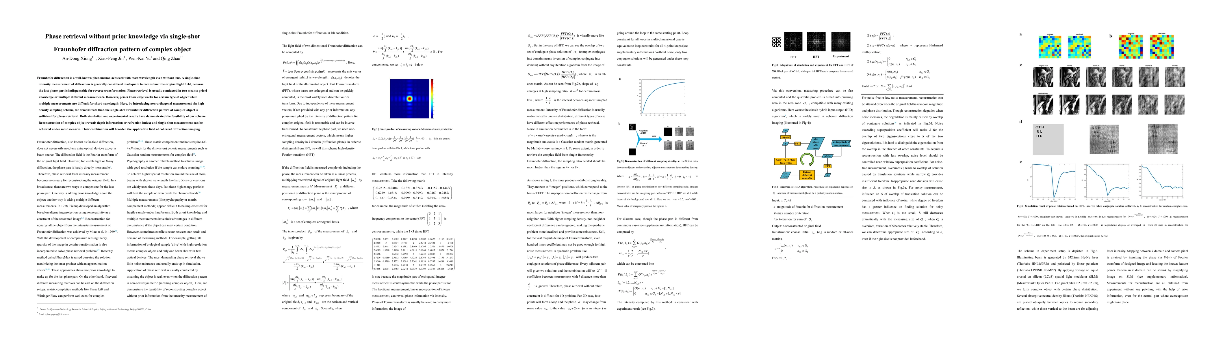 This paper proposes a method for phase retrieval from a single-shot Fraunhofer diffraction pattern without prior knowledge, using high-density sampling. This method enables reconstruction of complex objects, revealing depth information or refraction index, and is feasible for most scenarios, broadening the application of coherent diffraction imaging.