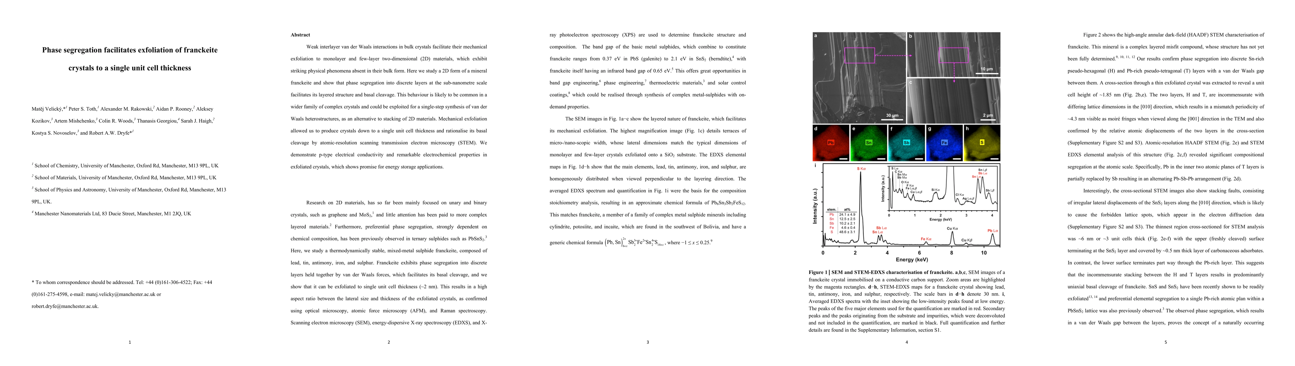 Weak interlayer van der Waals interactions in bulk crystals facilitate their mechanical exfoliation to monolayer and few-layer two-dimensional (2D) materials, which exhibit striking physical phenomena absent in their bulk form. Here we study a 2D form of a mineral franckeite and show that phase segregation into discrete layers at the sub-nanometre scale facilitates its layered structure and basal cleavage. This behaviour is likely to be common in a wider family of complex crystals and could be exploited for a single-step synthesis of van der Waals heterostructures, as an alternative to stacking of 2D materials. Mechanical exfoliation allowed us to produce crystals down to a single unit cell thickness and rationalise its basal cleavage by atomic-resolution scanning transmission electron microscopy (STEM). We demonstrate p-type electrical conductivity and remarkable electrochemical properties in exfoliated crystals, which shows promise for energy storage applications.