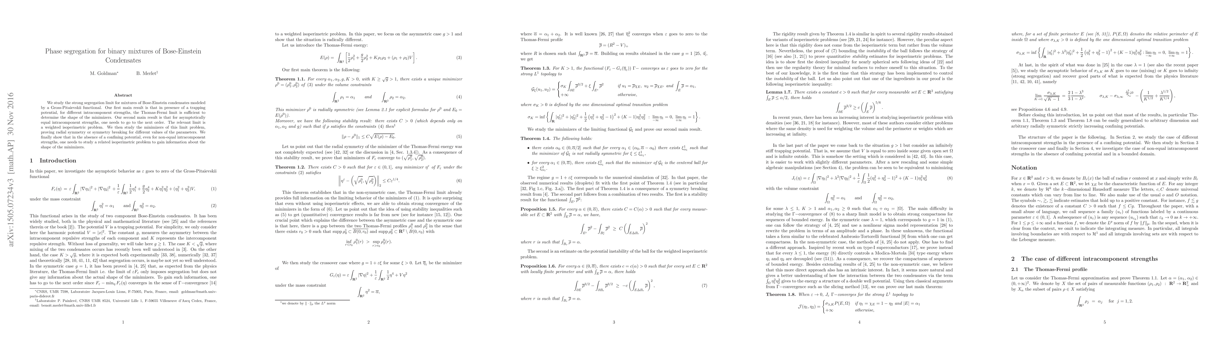 This paper investigates the phase segregation in binary mixtures of Bose-Einstein condensates using a Gross-Pitaievskii functional, showing that the Thomas-Fermi limit determines the shape of minimizers under trapping potentials. It also demonstrates that higher-order analysis is required for equal intracomponent strengths and explores related isoperimetric problems to understand minimizer shapes in the absence of a confining potential.