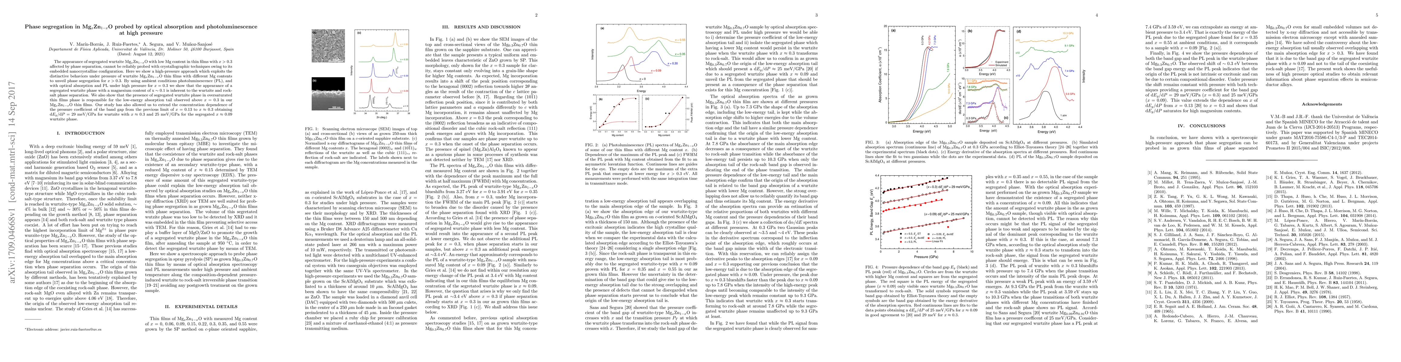 This study investigates the phase segregation in Mg$_x$Zn$_{1-x}$O thin films using high-pressure optical absorption and photoluminescence techniques. It reveals that a segregated wurtzite phase with low magnesium content is inherent to the phase separation in oversaturated films, explaining the low-energy absorption tail observed for $x>0.3$.