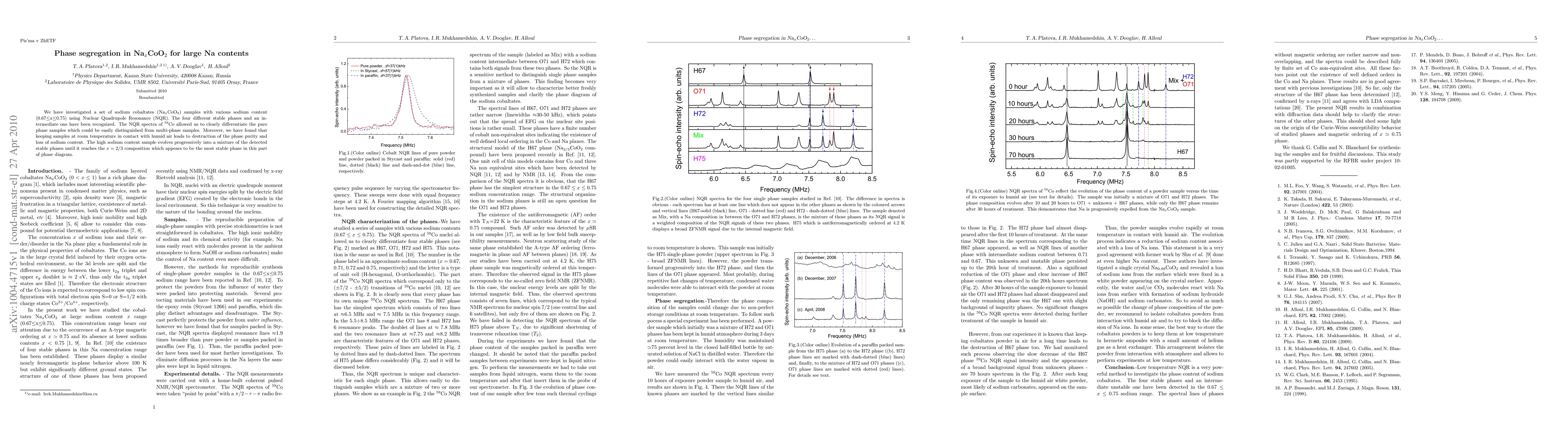 We have investigated a set of sodium cobaltates (NaxCoO2) samples with various sodium content (0.67 \le x \le 0.75) using Nuclear Quadrupole Resonance (NQR). The four different stable phases and an intermediate one have been recognized. The NQR spectra of 59Co allowed us to clearly differentiate the pure phase samples which could be easily distinguished from multi-phase samples. Moreover, we have found that keeping samples at room temperature in contact with humid air leads to destruction of the phase purity and loss of sodium content. The high sodium content sample evolves progressively into a mixture of the detected stable phases until it reaches the x=2/3 composition which appears to be the most stable phase in this part of phase diagram.