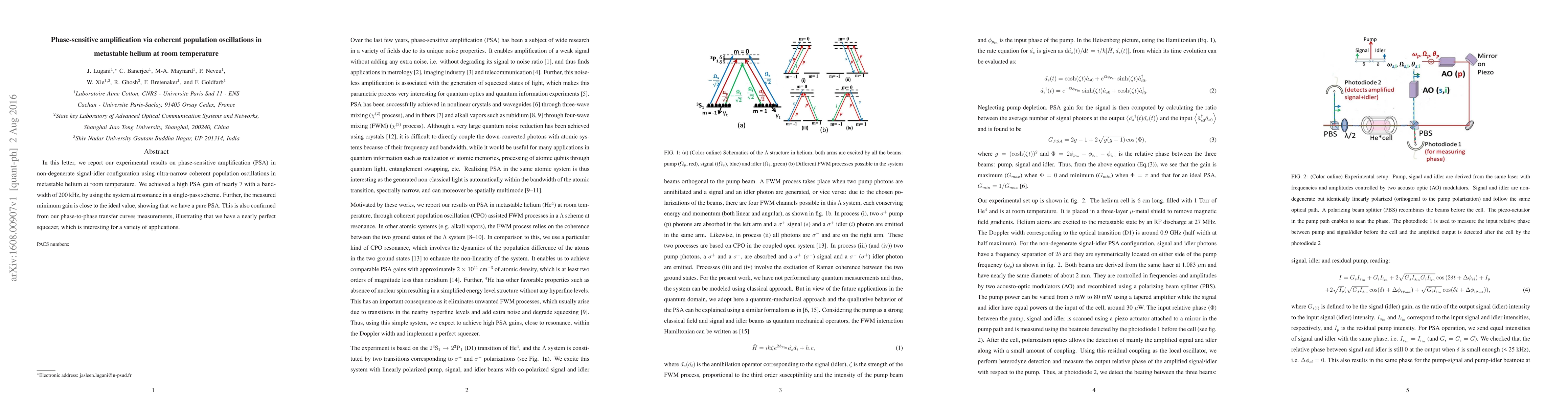 This paper reports on phase-sensitive amplification in metastable helium at room temperature, achieving high gain and bandwidth, demonstrating nearly perfect squeezing, and showing potential for various applications. The experimental results confirm a pure phase-sensitive amplification with minimal deviation from ideal values.