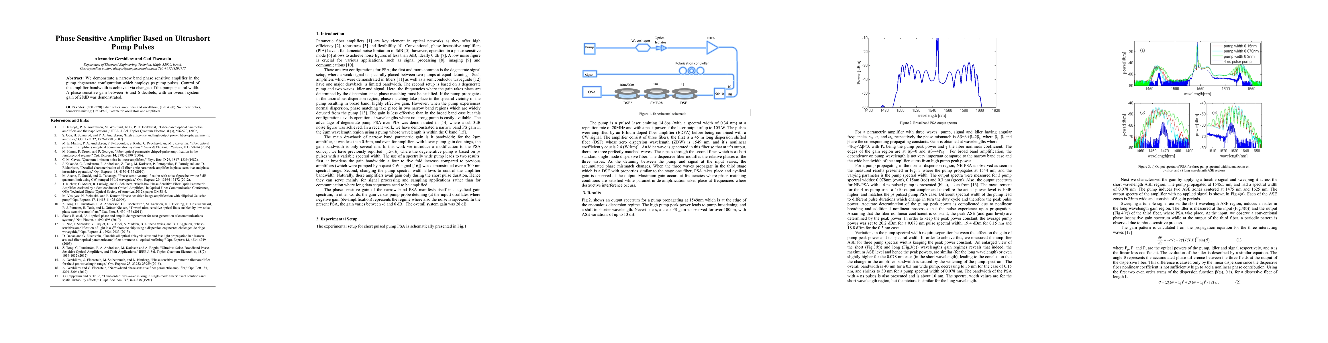This paper presents a narrow band phase sensitive amplifier utilizing ultrashort ps pump pulses, achieving control over bandwidth through pump spectral width adjustments. The system demonstrates phase sensitive gain ranging from -6 to 6 decibels, with an overall gain of 28dB.