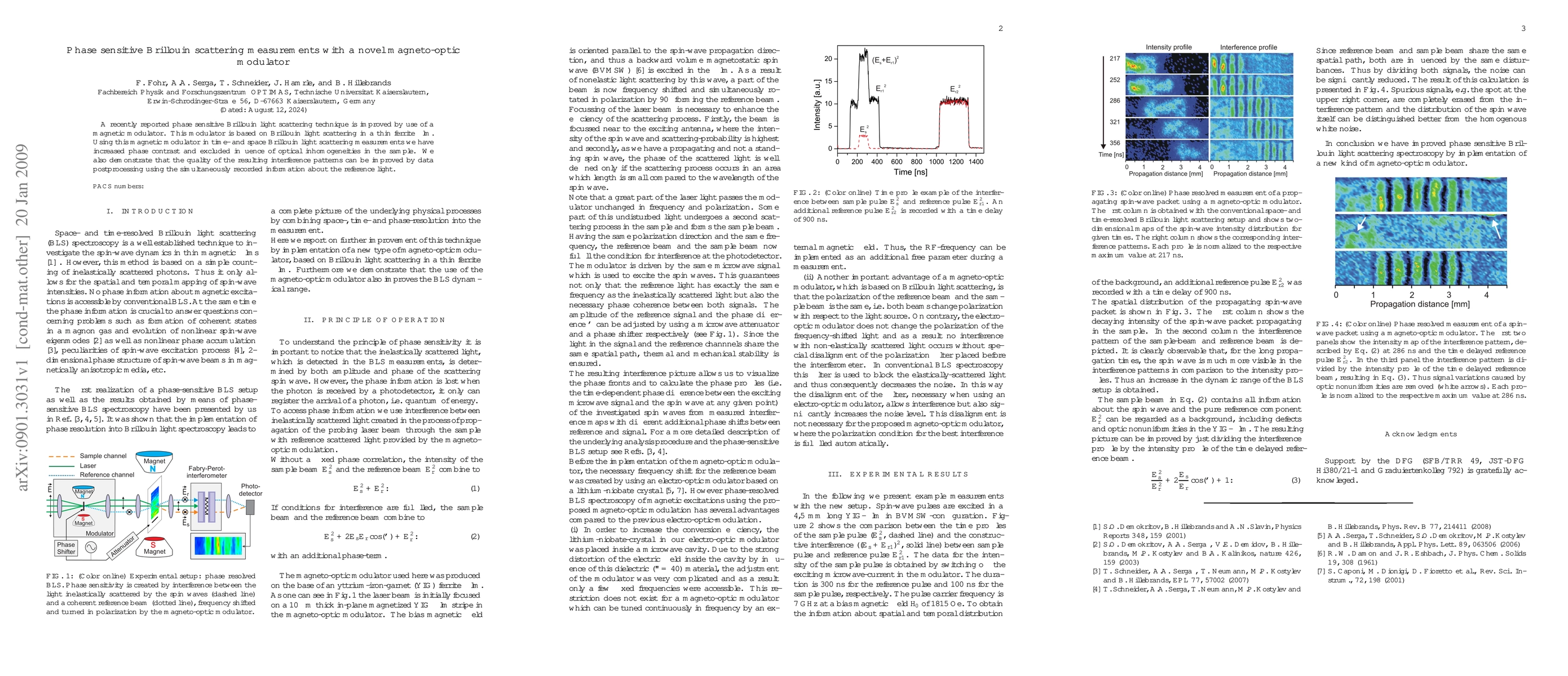 This paper improves phase sensitive Brillouin light scattering measurements using a novel magneto-optic modulator based on a thin ferrite film, enhancing phase contrast and excluding optical inhomogeneities. Postprocessing techniques further improve interference pattern quality.