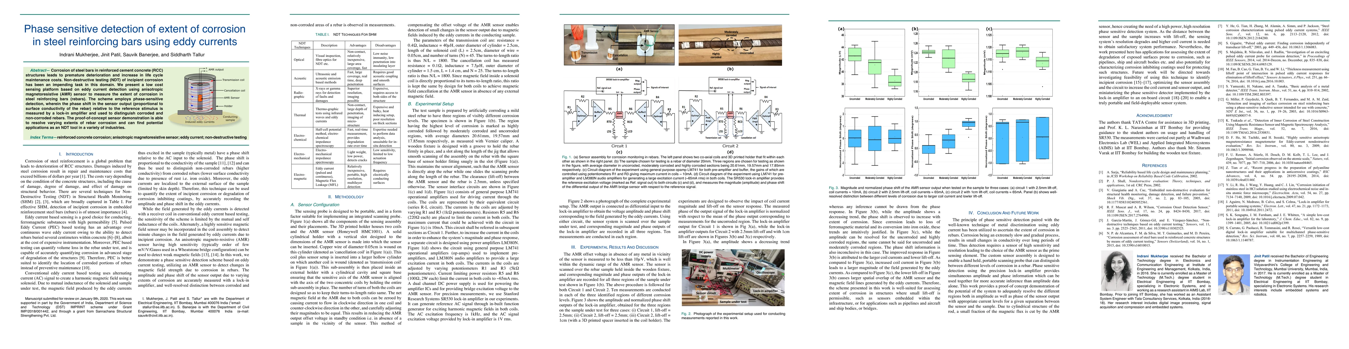 Corrosion of steel bars in reinforced cement concrete (RCC) structures leads to premature deterioration and increase in life cycle maintenance costs. Non-destructive testing (NDT) of incipient corrosion has been an impending task in this domain. We present a low cost sensing platform based on eddy current detection using anisotropic magnetoresistive (AMR) sensor to measure the extent of corrosion in steel reinforcing bars (rebars). The scheme employs phase-sensitive detection, wherein the phase shift in the sensor output (proportional to surface conductivity of the rebar) relative to the reference stimulus is measured by a lock-in amplifier and used to distinguish corroded and non-corroded rebars. The proof-of-concept sensor demonstration is able to resolve varying extents of rebar corrosion and can find potential applications as an NDT tool in a variety of industries.