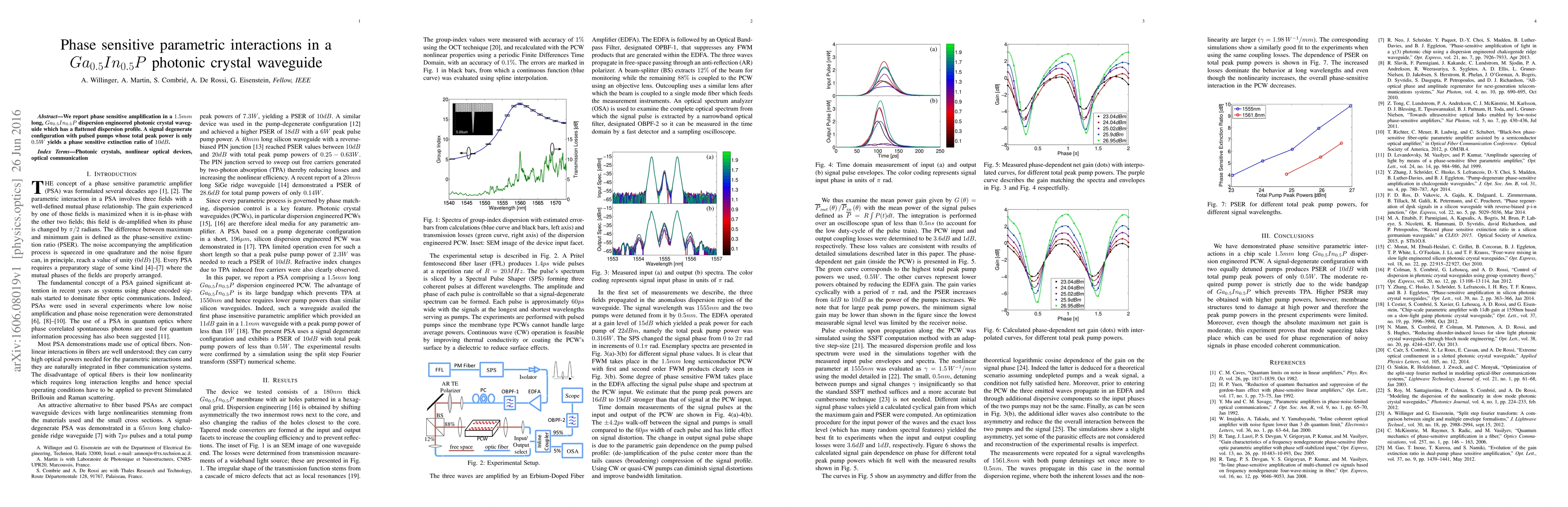 We report phase sensitive amplification in a 1.5mm long, $Ga_{0.5}In_{0.5}P$ dispersion engineered photonic crystal waveguide which has a flattened dispersion profile. A signal degenerate configuration with pulsed pumps whose total peak power is only 0.5W yields a phase sensitive extinction ratio of 10dB.
