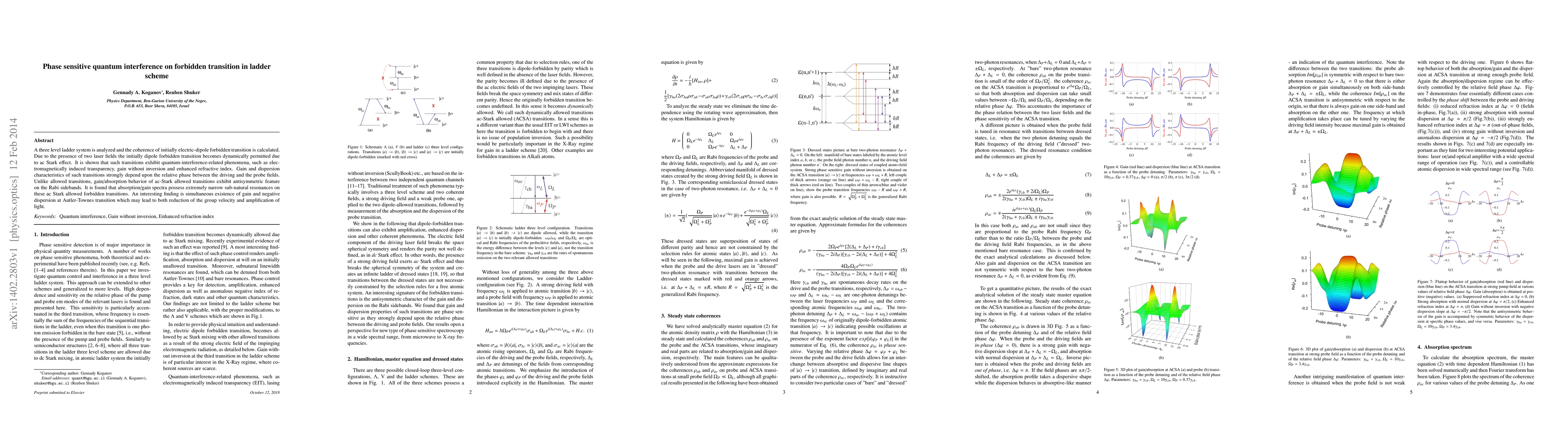 A three level ladder system is analyzed and the coherence of initially electric-dipole forbidden transition is calculated. Due to the presence of two laser fields the initially dipole forbidden transition becomes dynamically permitted due to ac Stark effect. It is shown that such transitions exhibit quantum-interference-related phenomena, such as electromagnetically induced transparency, gain without inversion and enhanced refractive index. Gain and dispersion characteristics of such transitions strongly depend upon the relative phase between the driving and the probe fields. Unlike allowed transitions, gain/absorption behavior of ac-Stark allowed transitions exhibit antisymmetric feature on the Rabi sidebands. It is found that absorption/gain spectra possess extremely narrow sub-natural resonances on these ac Stark allowed forbidden transitions. An interesting finding is simultaneous existence of gain and negative dispersion at Autler-Townes transition which may lead to both reduction of the group velocity and amplification of light.