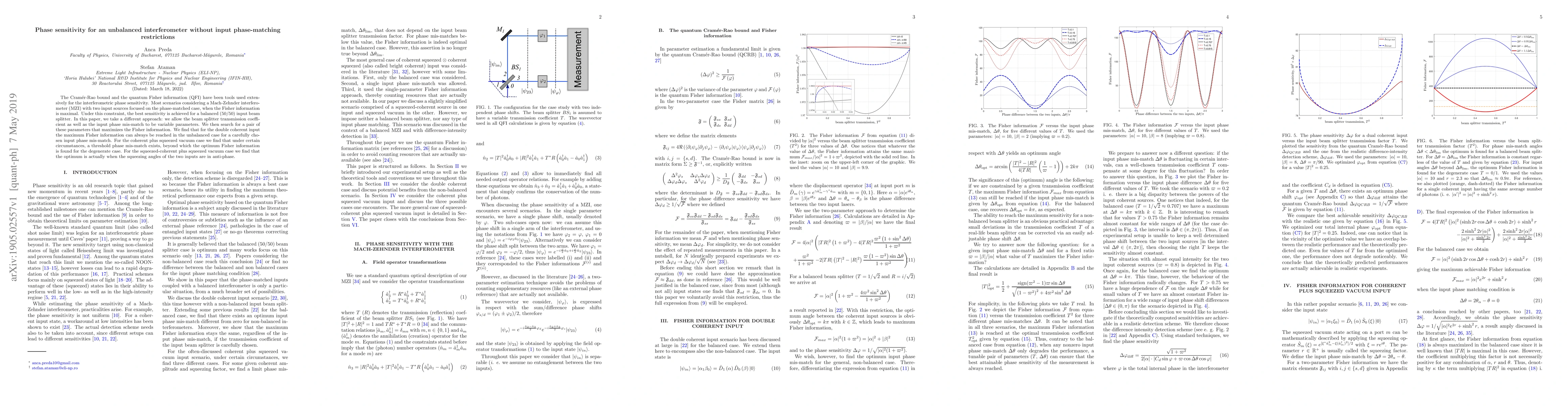 The Cram\'er-Rao bound and the quantum Fisher information have been tools used extensively for interferometric phase sensitivity. Most scenarios considering a Mach-Zehnder interferometer with two input sources focused on the phase-matched case, when the Fisher information is maximal. Under this constraint, the best sensitivity is achieved for a balanced (50/50) input beam splitter. In this paper, we take a different approach: we allow the beam splitter transmission coefficient as well as the input phase mismatch to be variable parameters. We then search for a pair of these parameters that maximizes the Fisher information. We find that for the double coherent input the maximum Fisher information can always be reached in the unbalanced case for a carefully chosen input phase mismatch. For the coherent plus squeezed vacuum case we find that under certain circumstances a threshold phase mismatch exists, beyond which the optimum Fisher information is found for the degenerate case. For the squeezed-coherent plus squeezed vacuum case we find that the optimum actually occurs when the squeezing angles of the two inputs are in anti-phase.