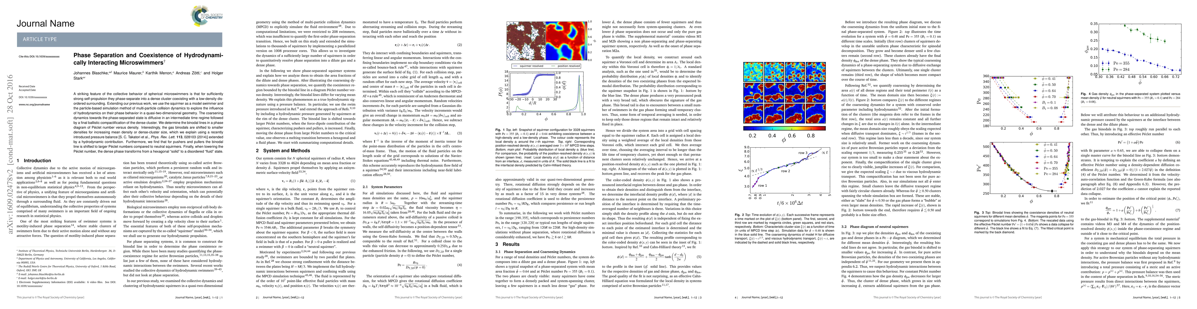A striking feature of the collective behavior of spherical microswimmers is that for sufficiently strong self-propulsion they phase-separate into a dense cluster coexisting with a low-density dis- ordered surrounding. Extending our previous work, we use the squirmer as a model swimmer and the particle-based simulation method of multi-particle collision dynamics to explore the influence of hydrodynamics on their phase behavior in a quasi-two-dimensional geometry. The coarsening dynamics towards the phase-separated state is diffusive in an intermediate time regime followed by a final ballistic compactification of the dense cluster. We determine the binodal lines in a phase diagram of P\'eclet number versus density. Interestingly, the gas binodals are shifted to smaller densities for increasing mean density or dense-cluster size, which we explain using a recently introduced pressure balance [S. C. Takatori et al., Phys. Rev. Lett. 113, 028103 (2014)] extended by a hydrodynamic contribution. Furthermore, we find that for pushers and pullers the binodal line is shifted to larger P\'eclet numbers compared to neutral squirmers. Finally, when lowering the P\'eclet number, the dense phase transforms from a hexagonal "solid" to a disordered "fluid" state.
