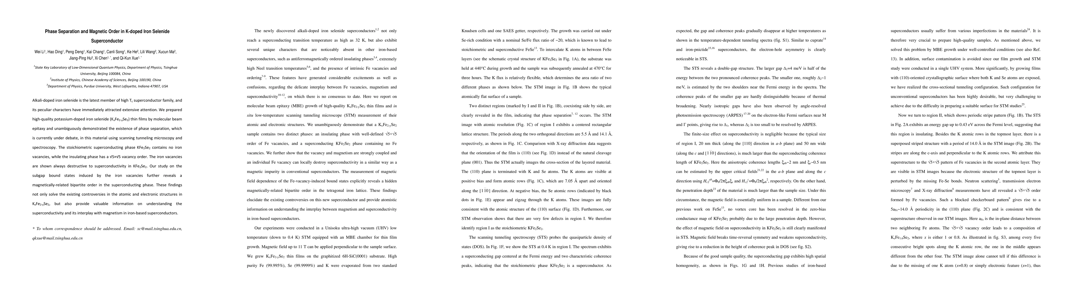 This study demonstrates phase separation in potassium-doped iron selenide superconductors using scanning tunneling microscopy, revealing that iron vacancies destroy superconductivity. It also uncovers a magnetically-related bipartite order in the superconducting phase, providing insights into the interplay between superconductivity and magnetism in iron-based superconductors.