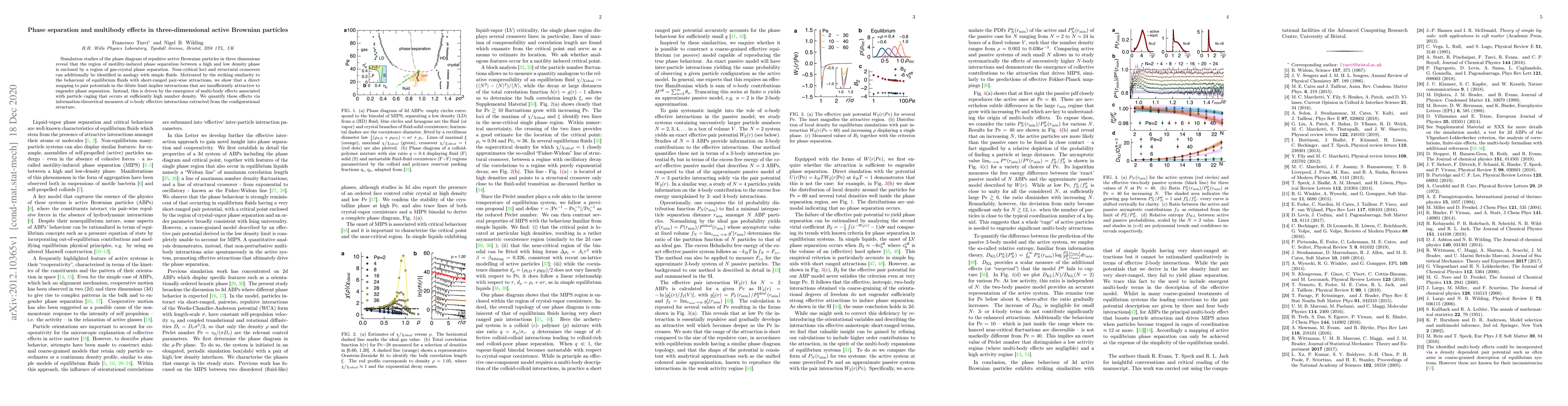 Simulation studies of the phase diagram of repulsive active Brownian particles in three dimensions reveal that the region of motility-induced phase separation between a high and low density phase is enclosed by a region of gas-crystal phase separation. Near-critical loci and structural crossovers can additionally be identified in analogy with simple fluids. Motivated by the striking similarity to the behaviour of equilibrium fluids with short-ranged pair-wise attractions, we show that a direct mapping to pair potentials in the dilute limit implies interactions that are insufficiently attractive to engender phase separation. Instead, this is driven by the emergence of multi-body effects associated with particle caging that occurs at sufficiently high number density. We quantify these effects via information-theoretical measures of $n$-body effective interactions extracted from the configurational structure.